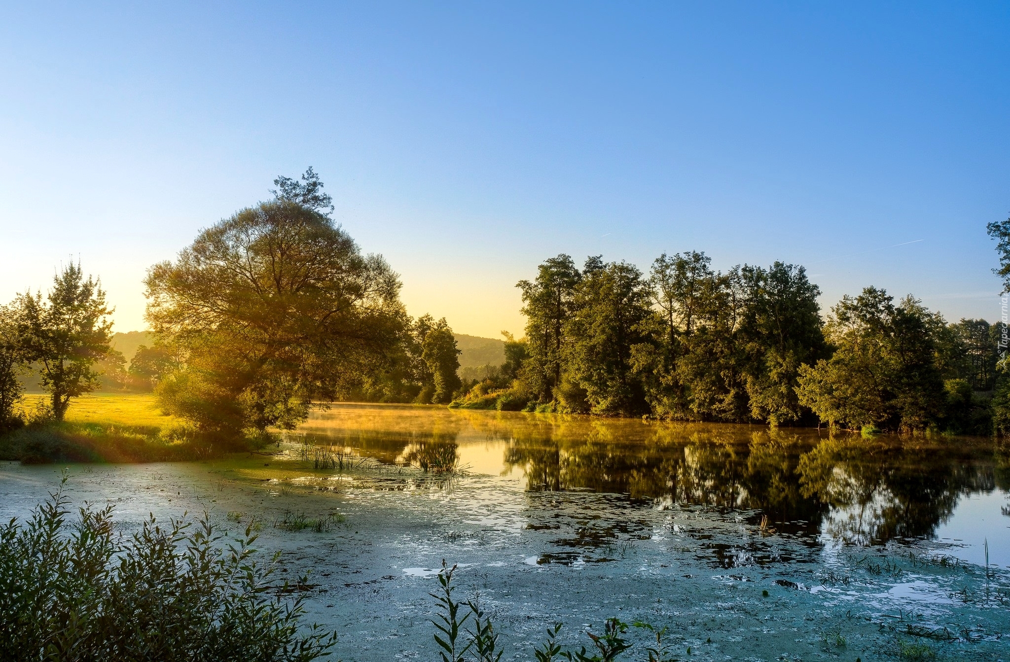 Edytor tapety: Rzeka, Drzewa, Przebijające, Światło, Odbicie