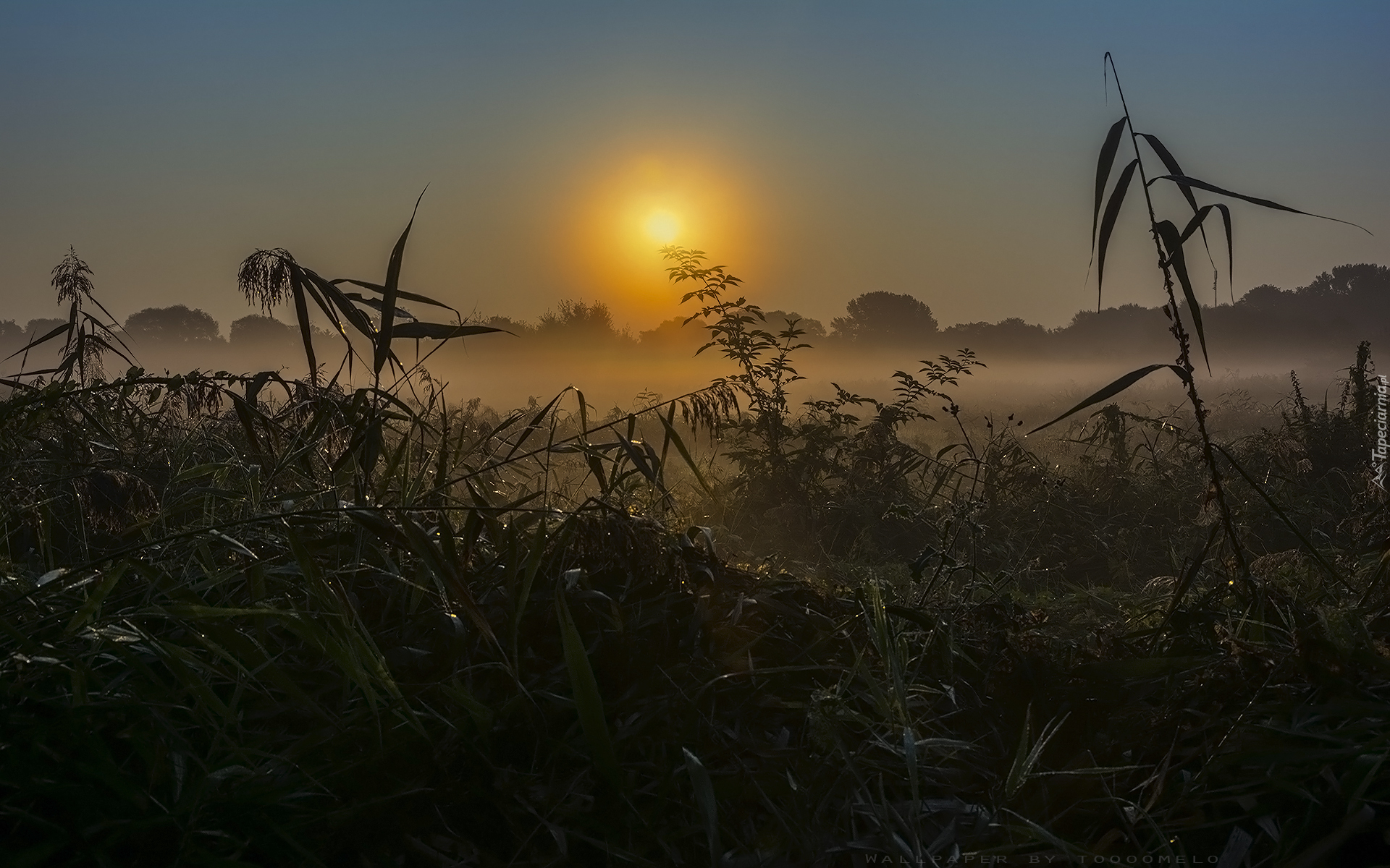 Edytor tapety: Wschód słońca, Poranek, Mgła, Trzciny
