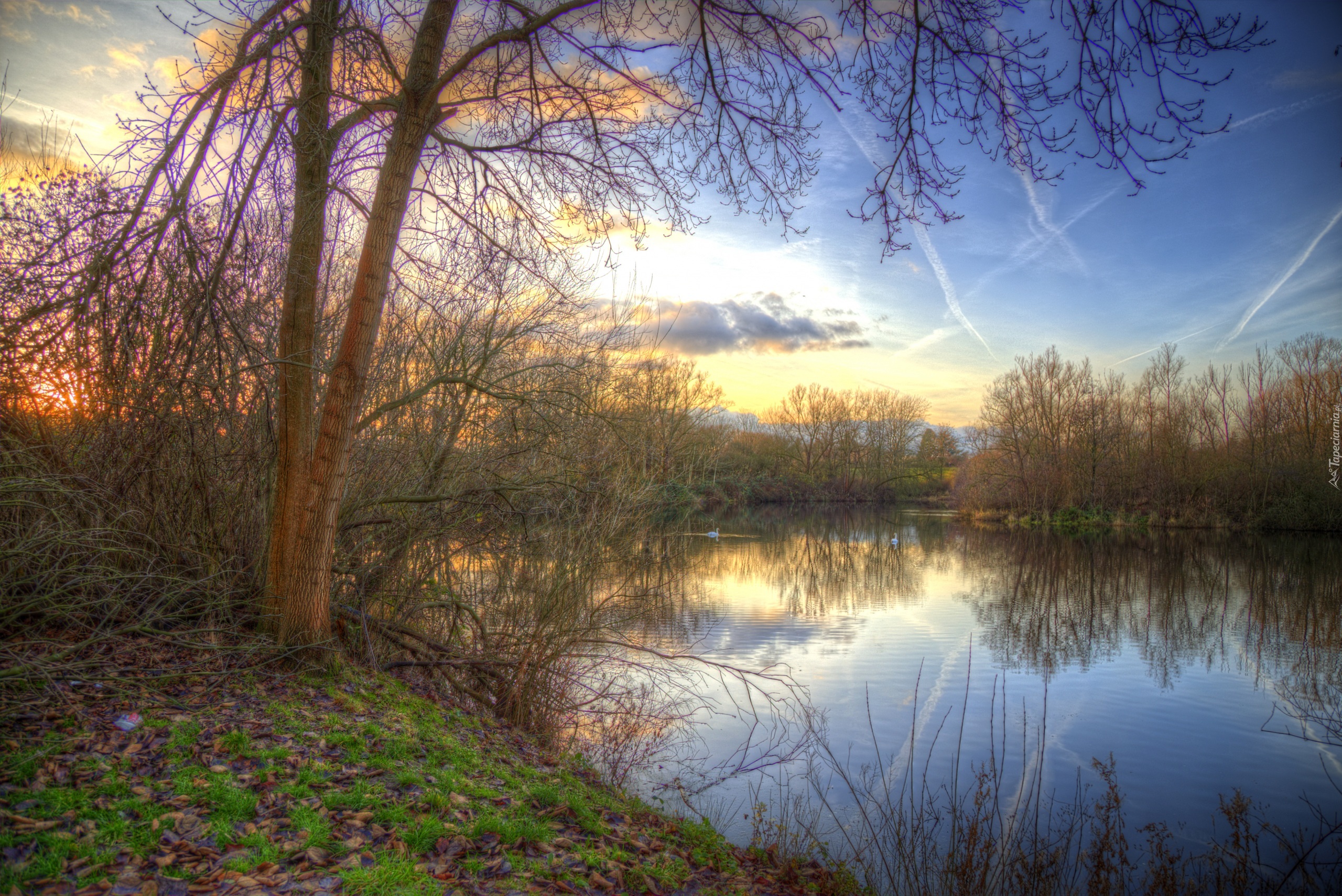Edytor tapety: Rzeka, Drzewa, Niebo, Wschód słońca