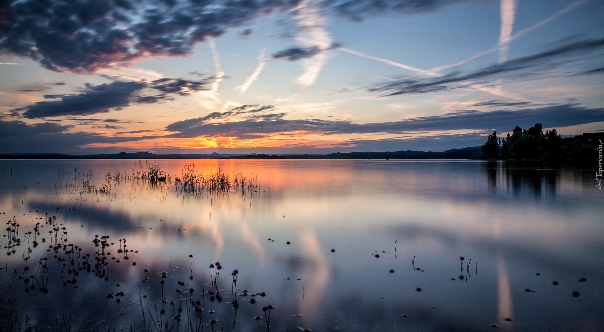 Edytor tapety: Jezioro, Niebo, Drzewa, Rośliny, Wschód, Słońca