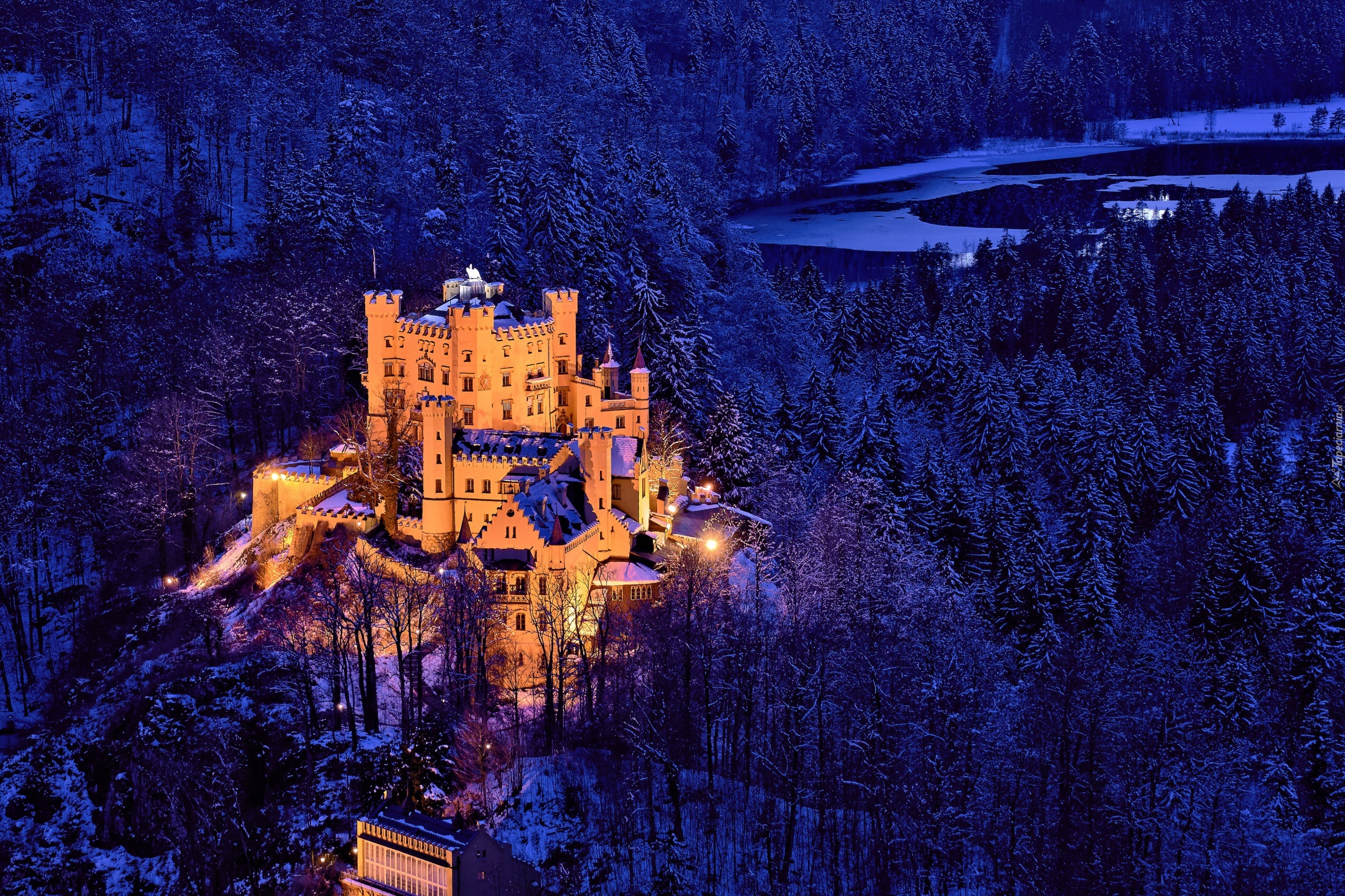 Edytor tapety: Niemcy, Bawaria, Zamek Hohenschwangau, Las, Jezioro