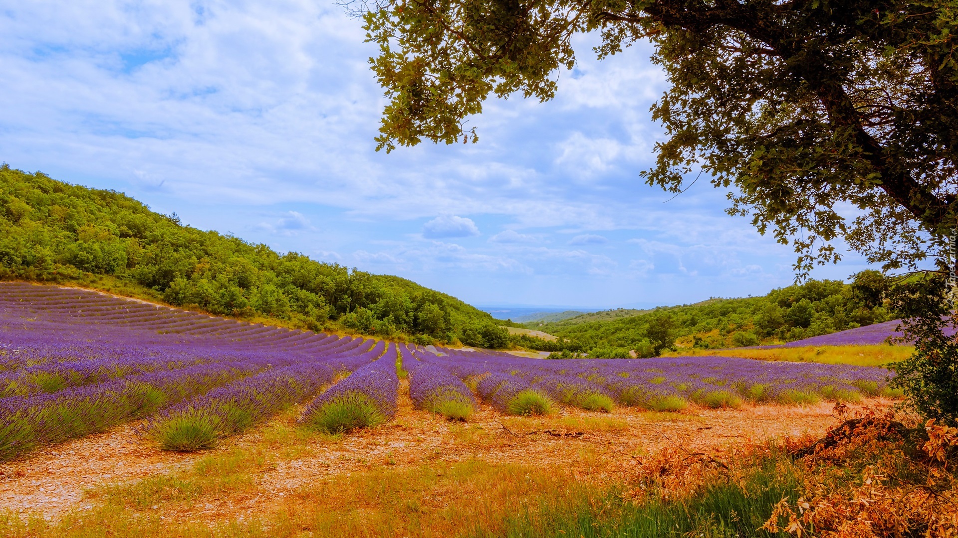 Edytor tapety: Krajobraz, Uprawa, Lawenda, Drzewo