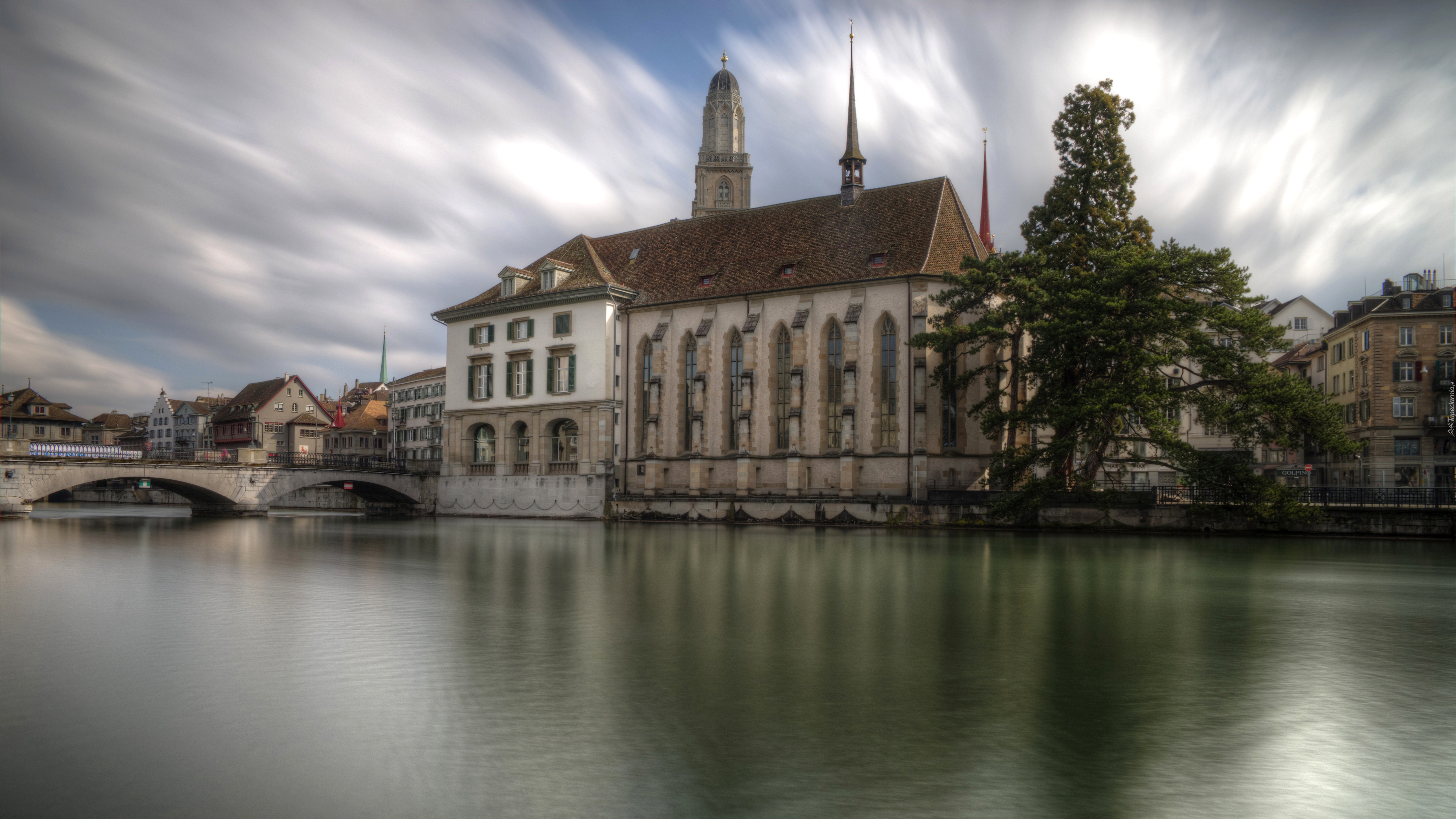 Edytor tapety: Szwajcaria, Zurych, Wieża Katedry Grossmunster, Rzeka Limmat