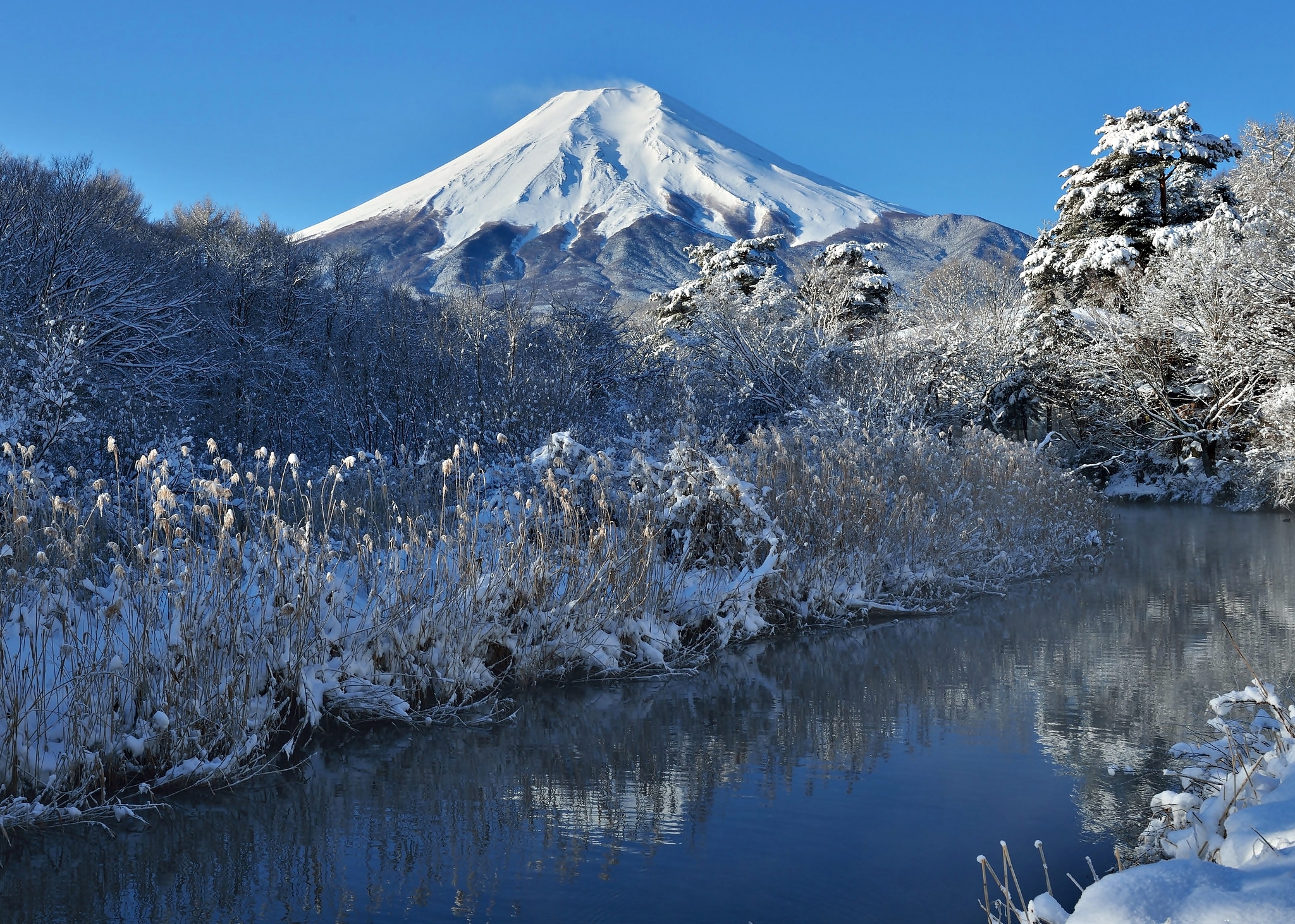 Edytor tapety: Zima, Góra, Fuji, Rzeka, Japonia