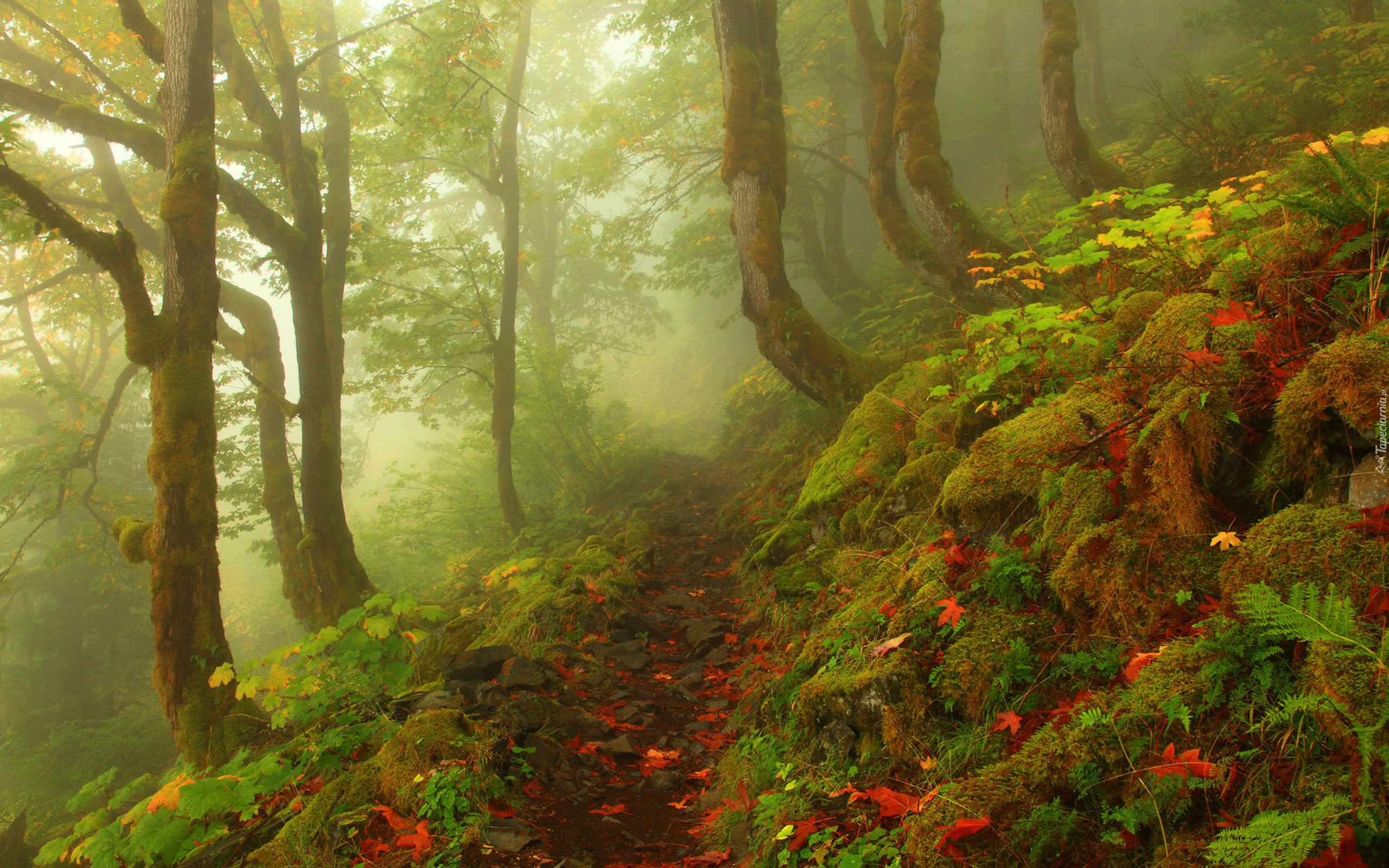 Edytor tapety: Las, Drzewa, Liście, Mech, Przebijające, Światło, Dróżka, Mgła