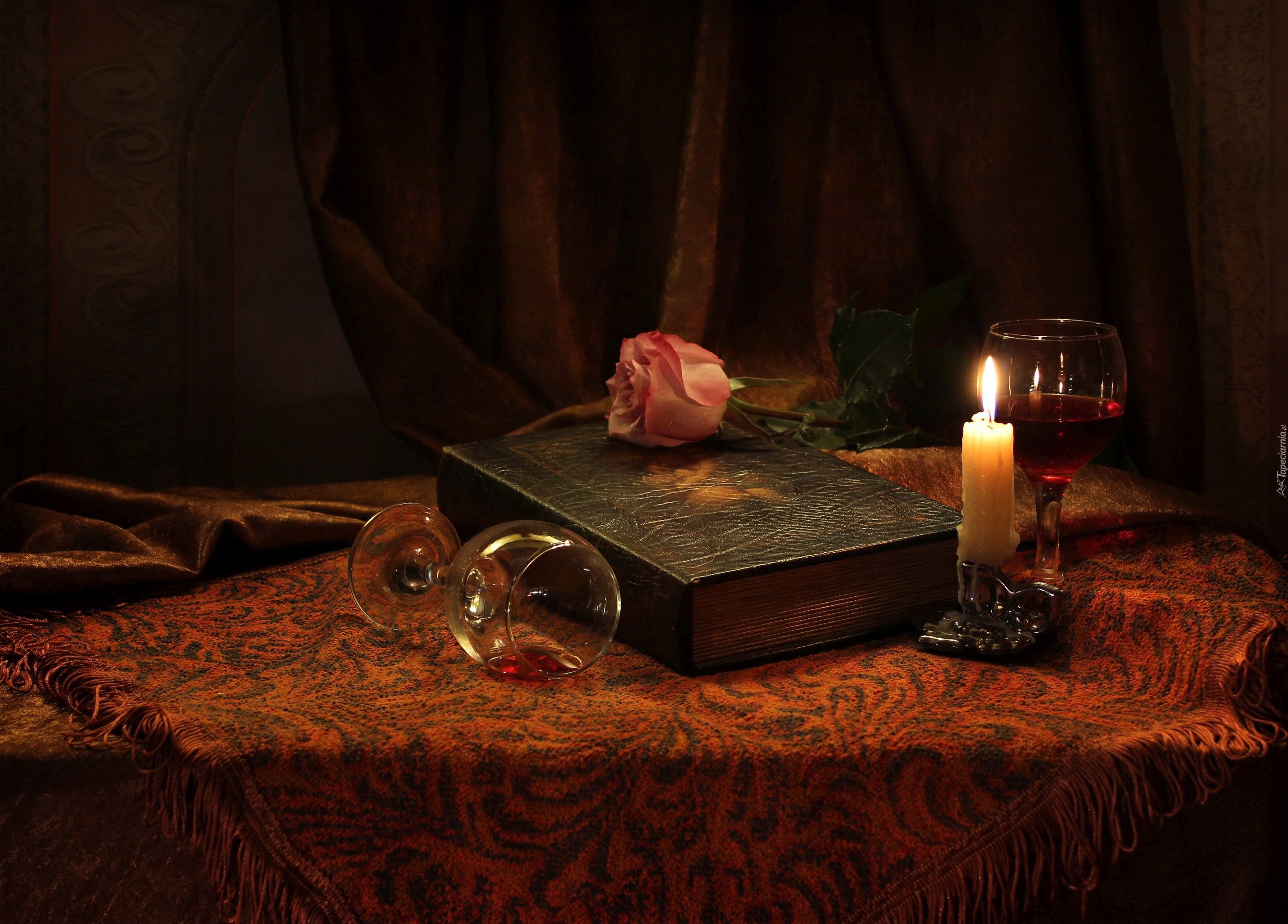 Edytor tapety: Kompozycja, Róża, Książka, Kieliszki, Wino, Świeca