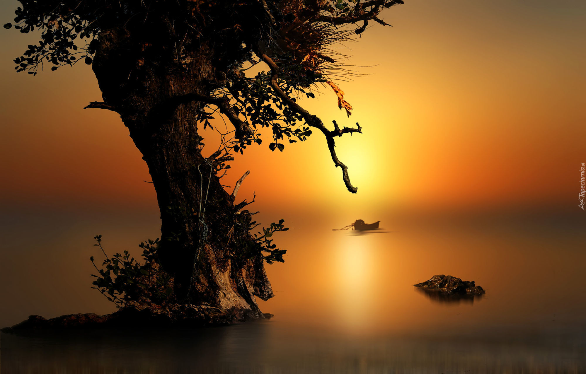 Edytor tapety: Zachód, Słońca, Jezioro, Drzewo, Łódka