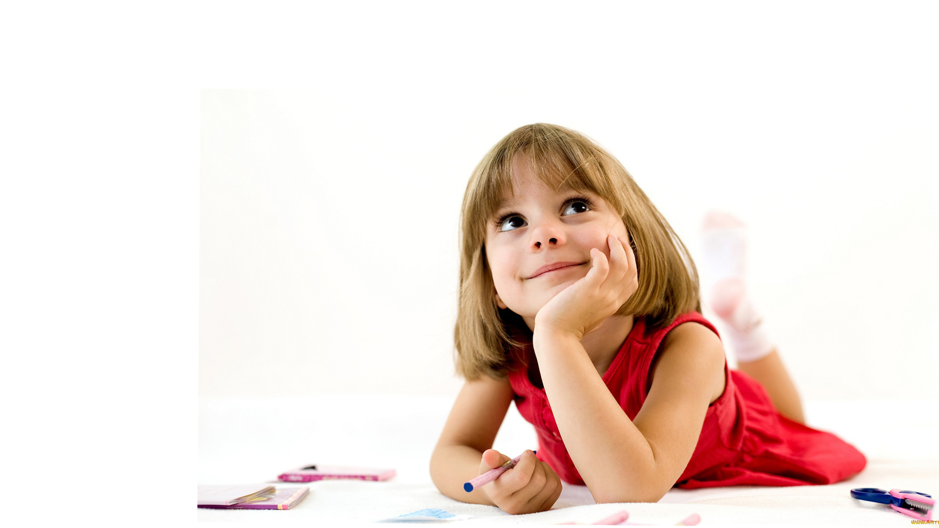Edytor tapety: Dziewczynka, Uśmiechnięta, Zamyślona, Kredki