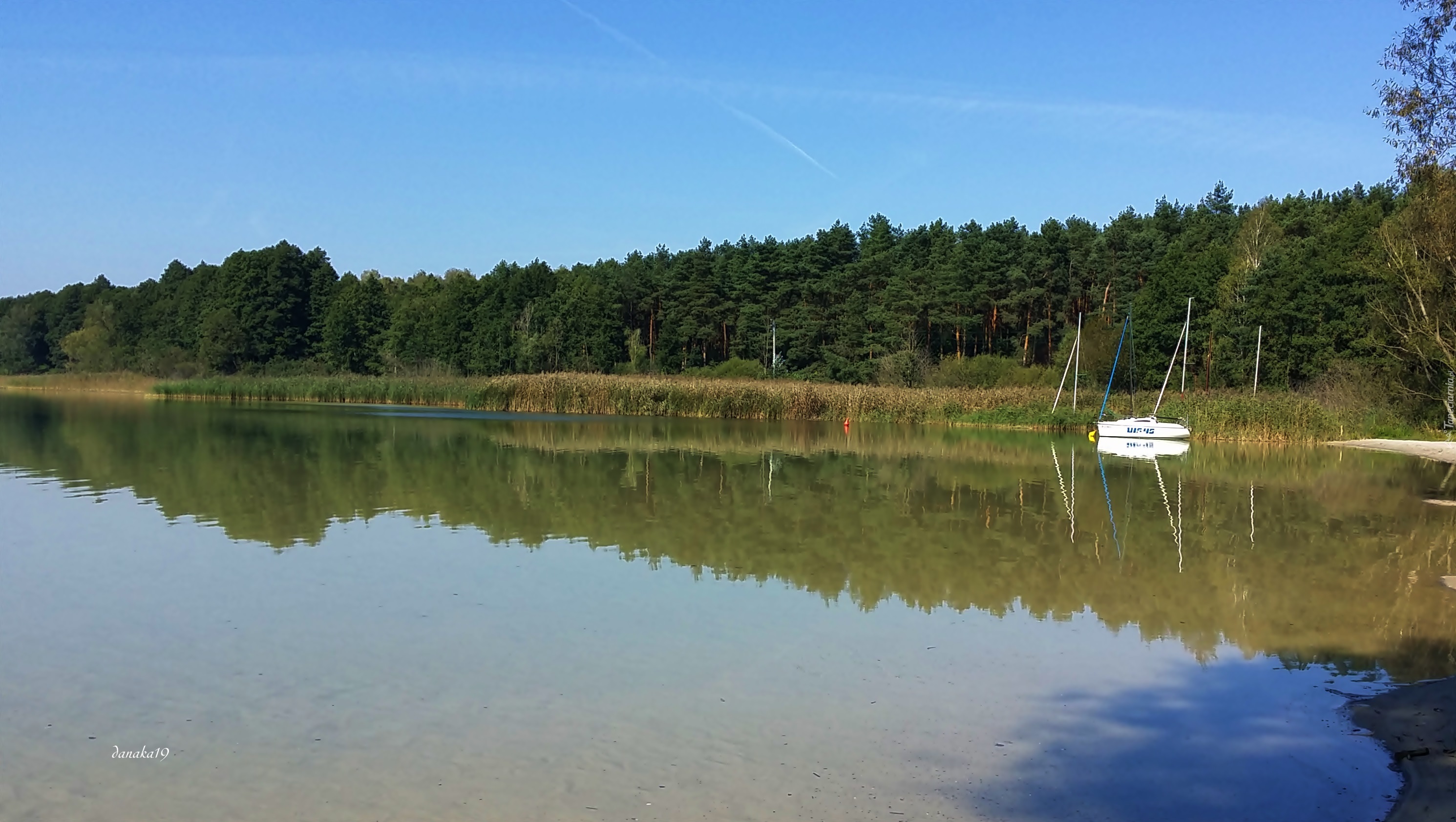 Edytor tapety: Jezioro, Las, Odbicie, Żaglówka, Lato