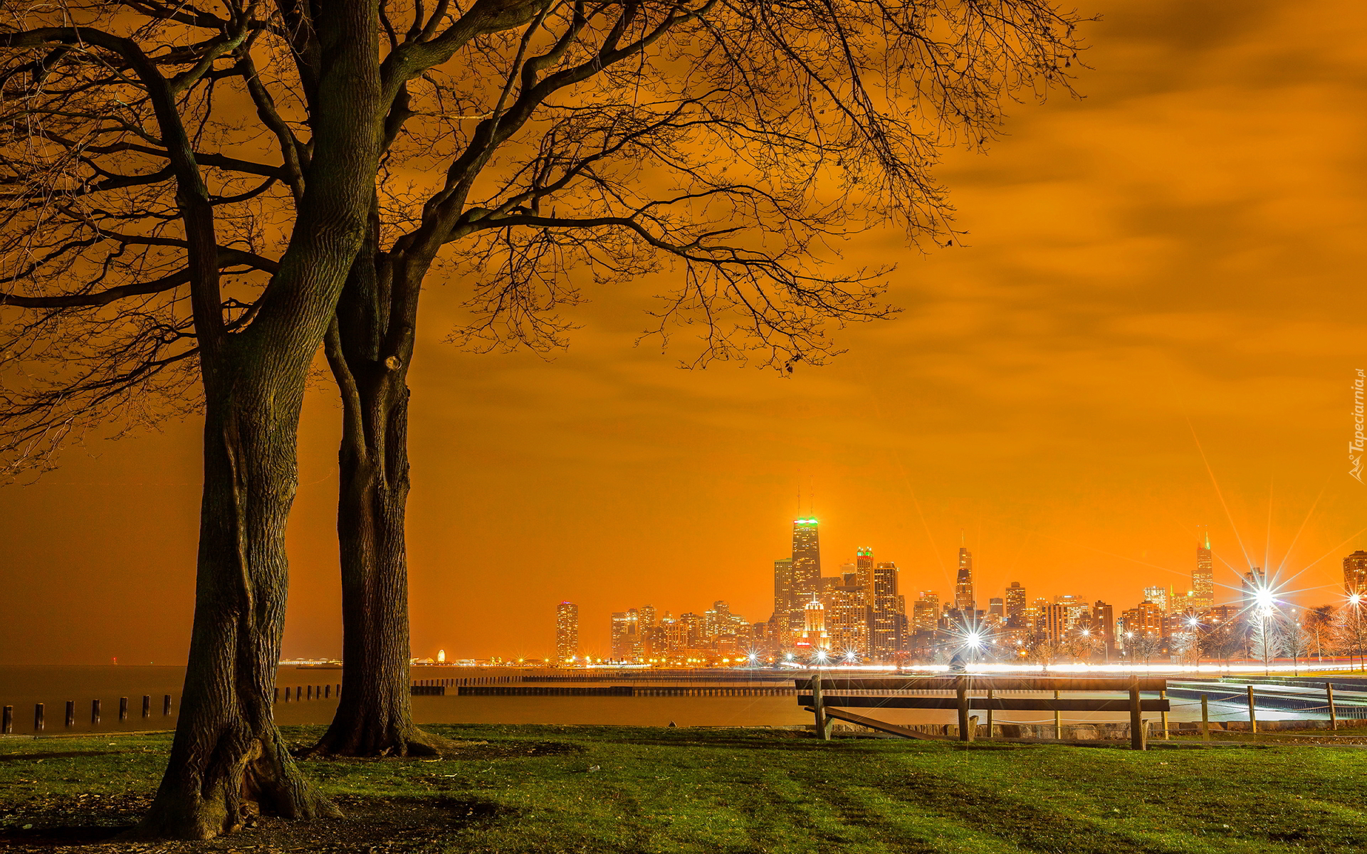 Edytor tapety: Drzewa, Ławeczka, Miasto, Noc, Światła