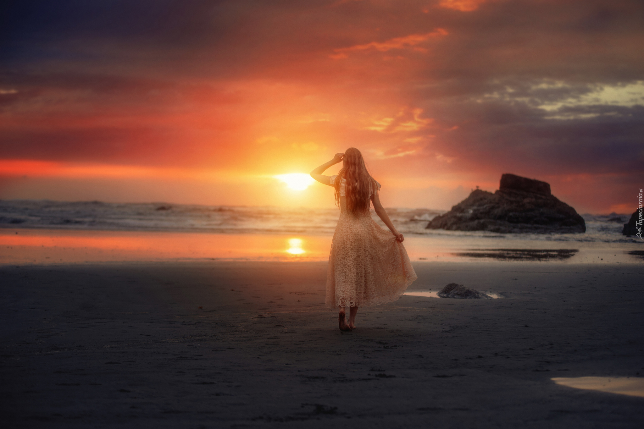 Edytor tapety: Morze, Zachód, Słońca, Kobieta, Skała