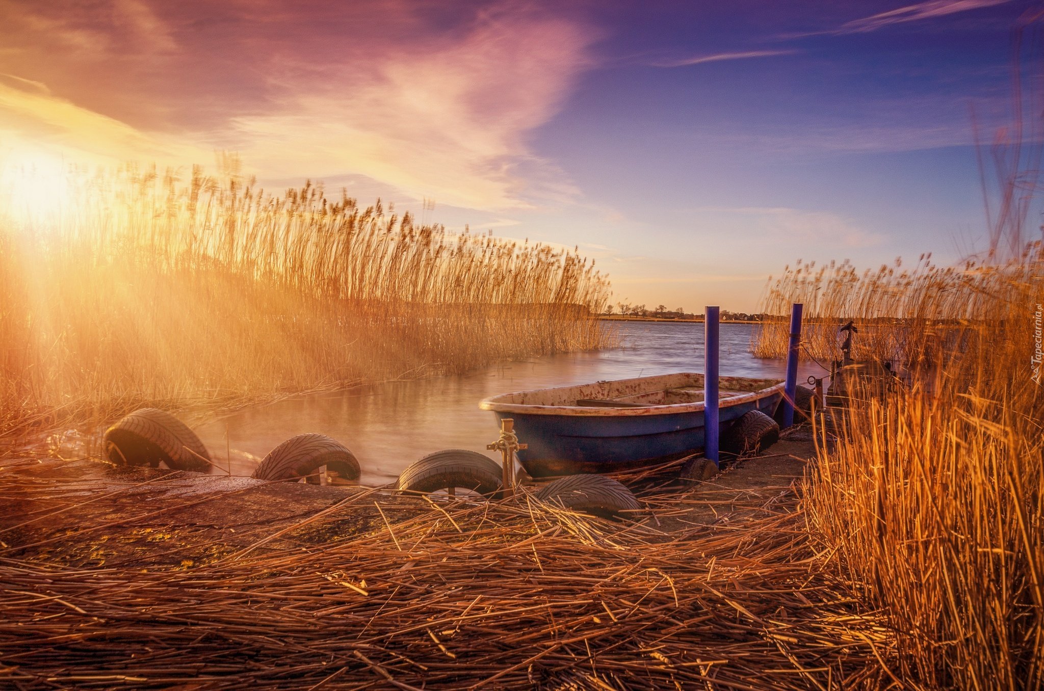 Edytor tapety: Jezioro, Wschód słońca, Mgła, Łódź