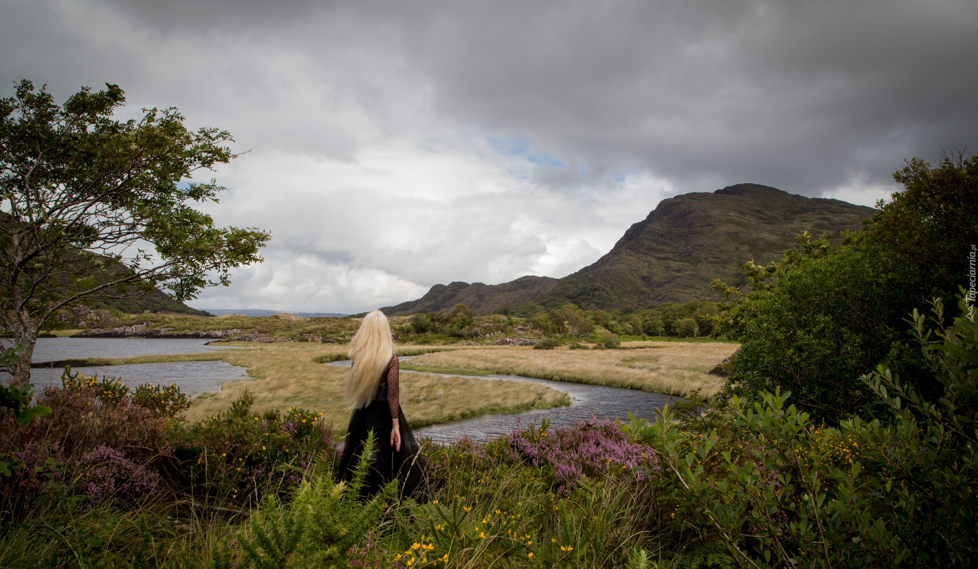 Edytor tapety: Wzgórza, Rzeka, Kwiaty, Trawa, Kobieta, Chmury