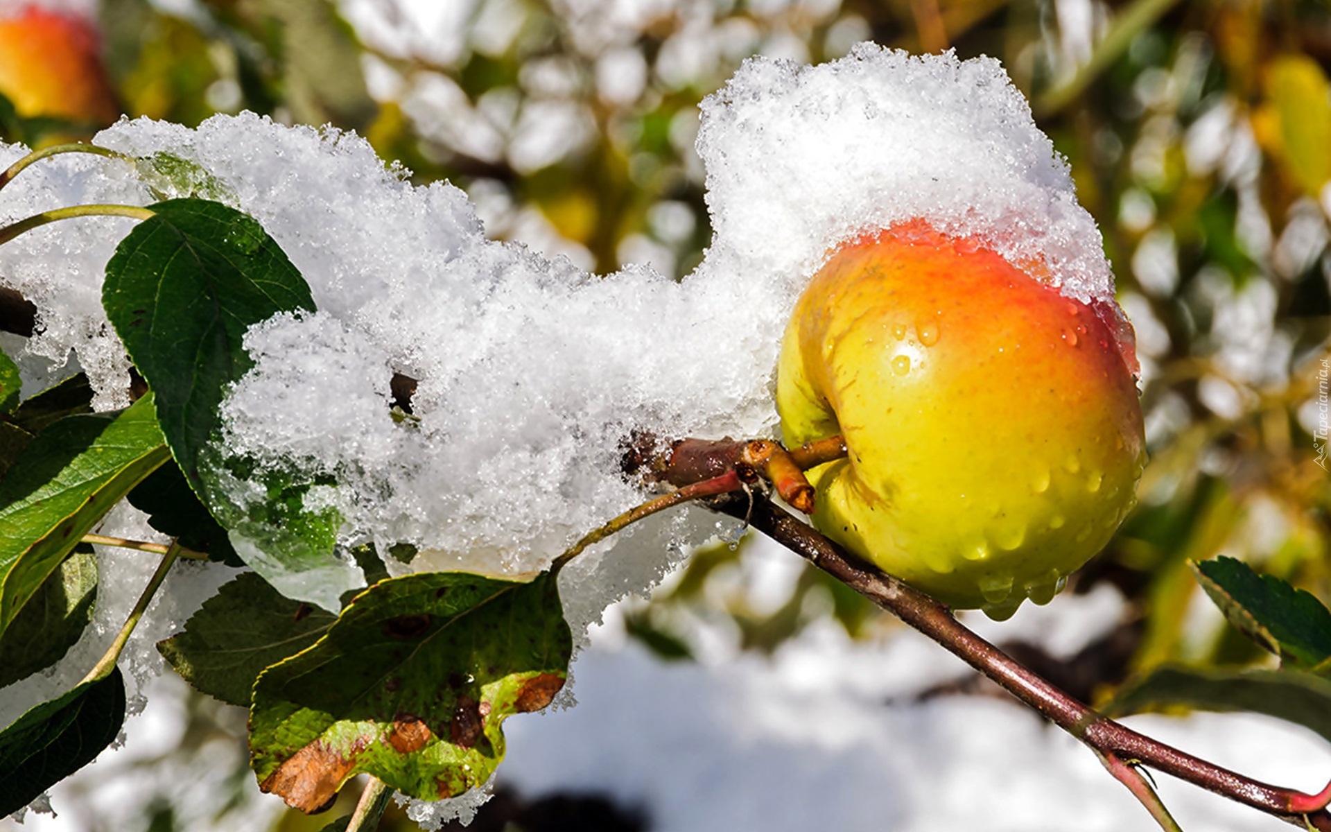 Edytor tapety: Jabłko, Gałązki, Śnieg, Krople