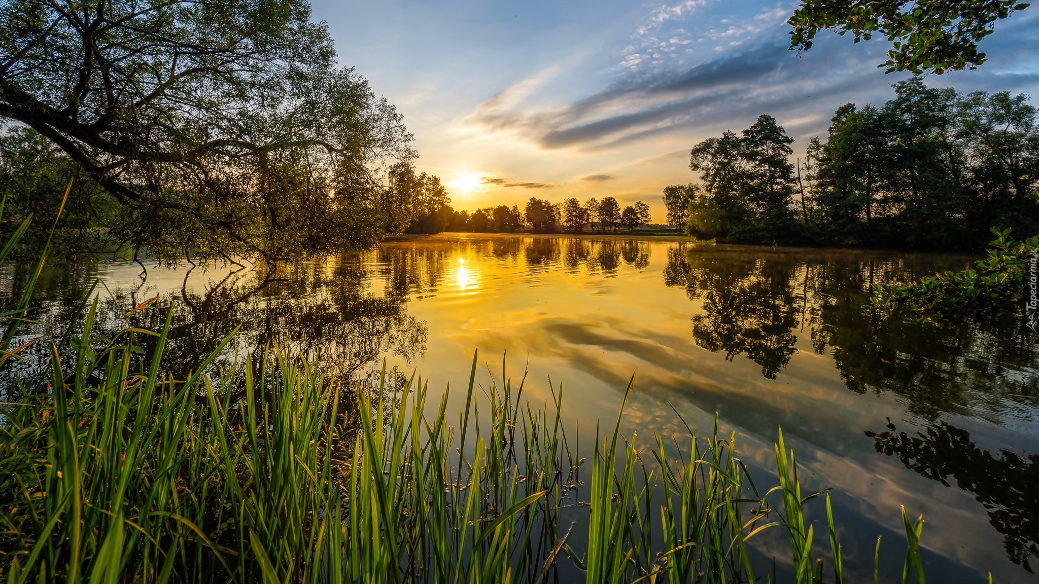 Edytor tapety: Rzeka, Drzewa, Trawy, Zachód, Słońca