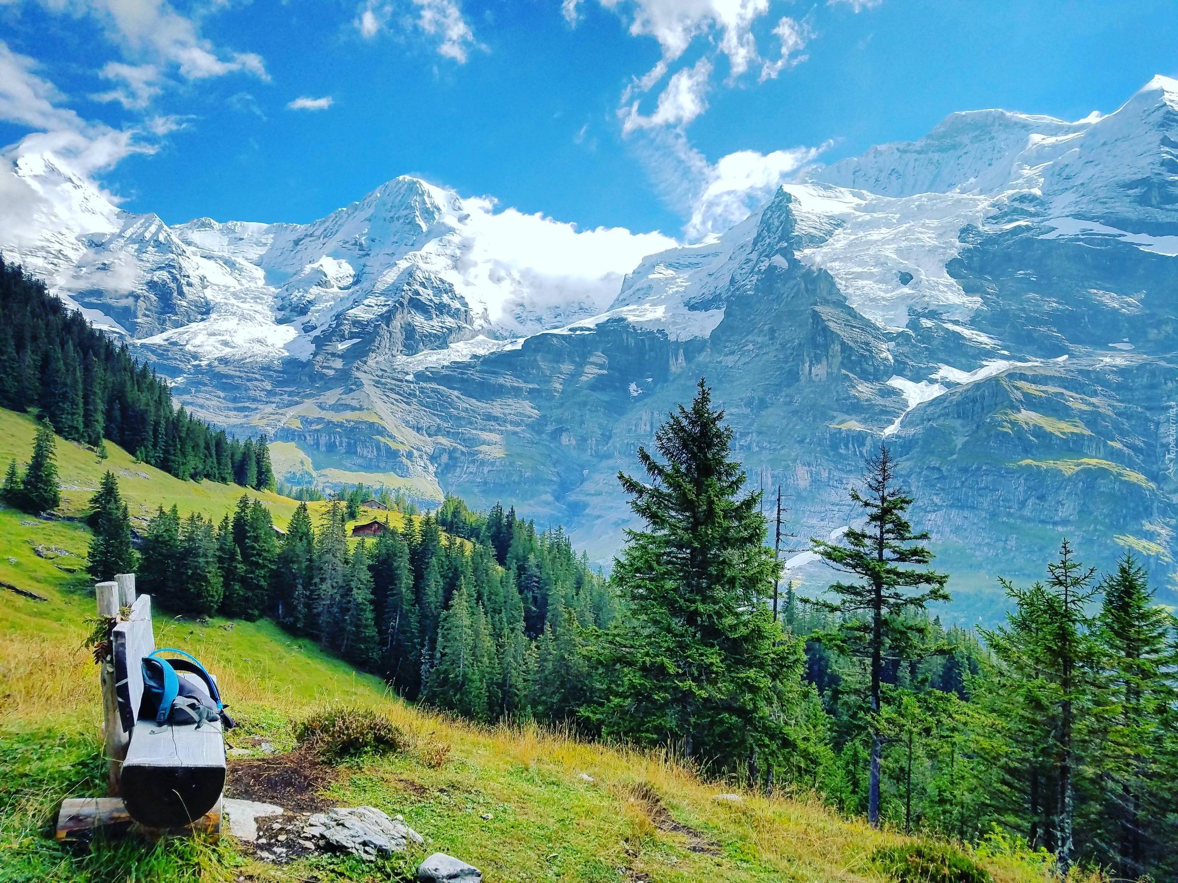 Edytor tapety: Góry, Śnieg, Las, Drzewa, Domki, Ławeczka
