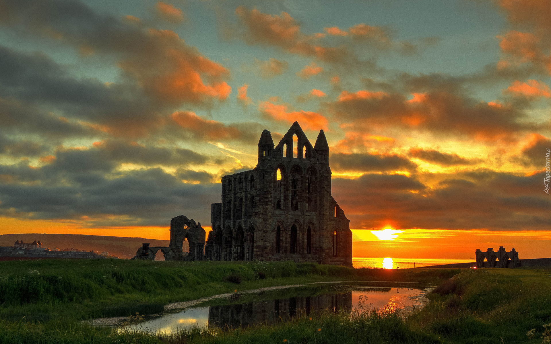 Edytor tapety: Rzeka, Zachód słońca, Chmury, Ruiny