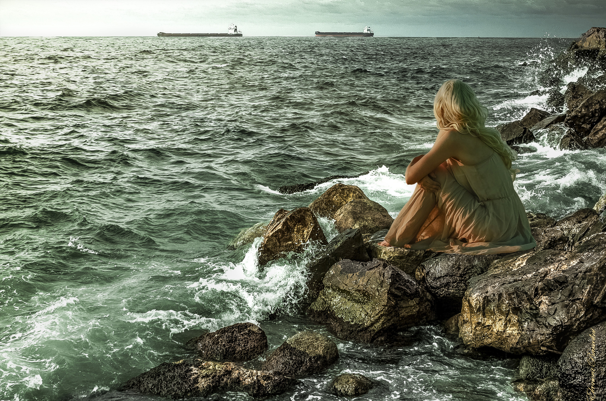 Edytor tapety: Morze, Kobieta, Statki, Kamienie