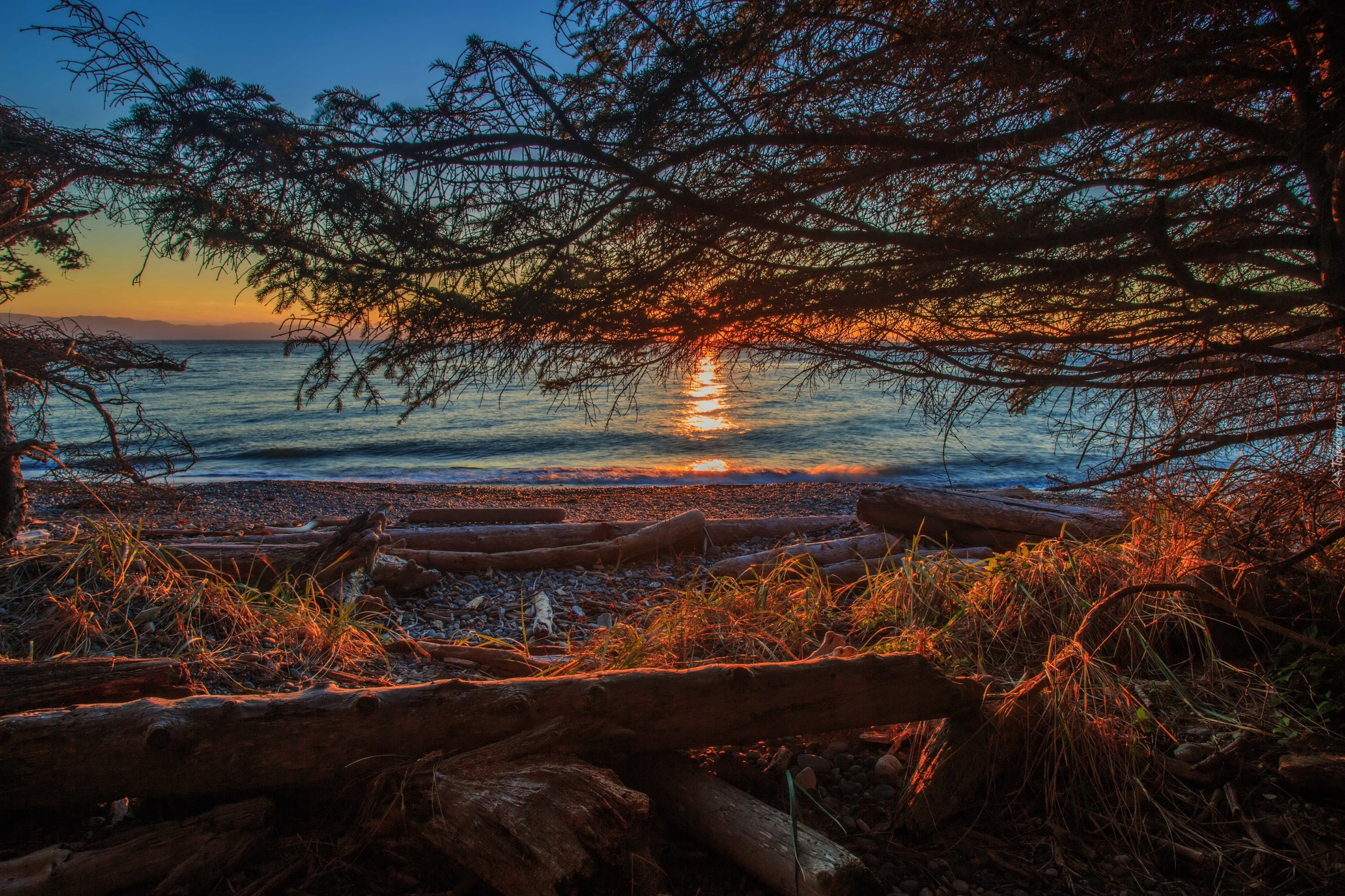 Edytor tapety: Brzeg, Jeziora, Wschód, Słońca, Kłody