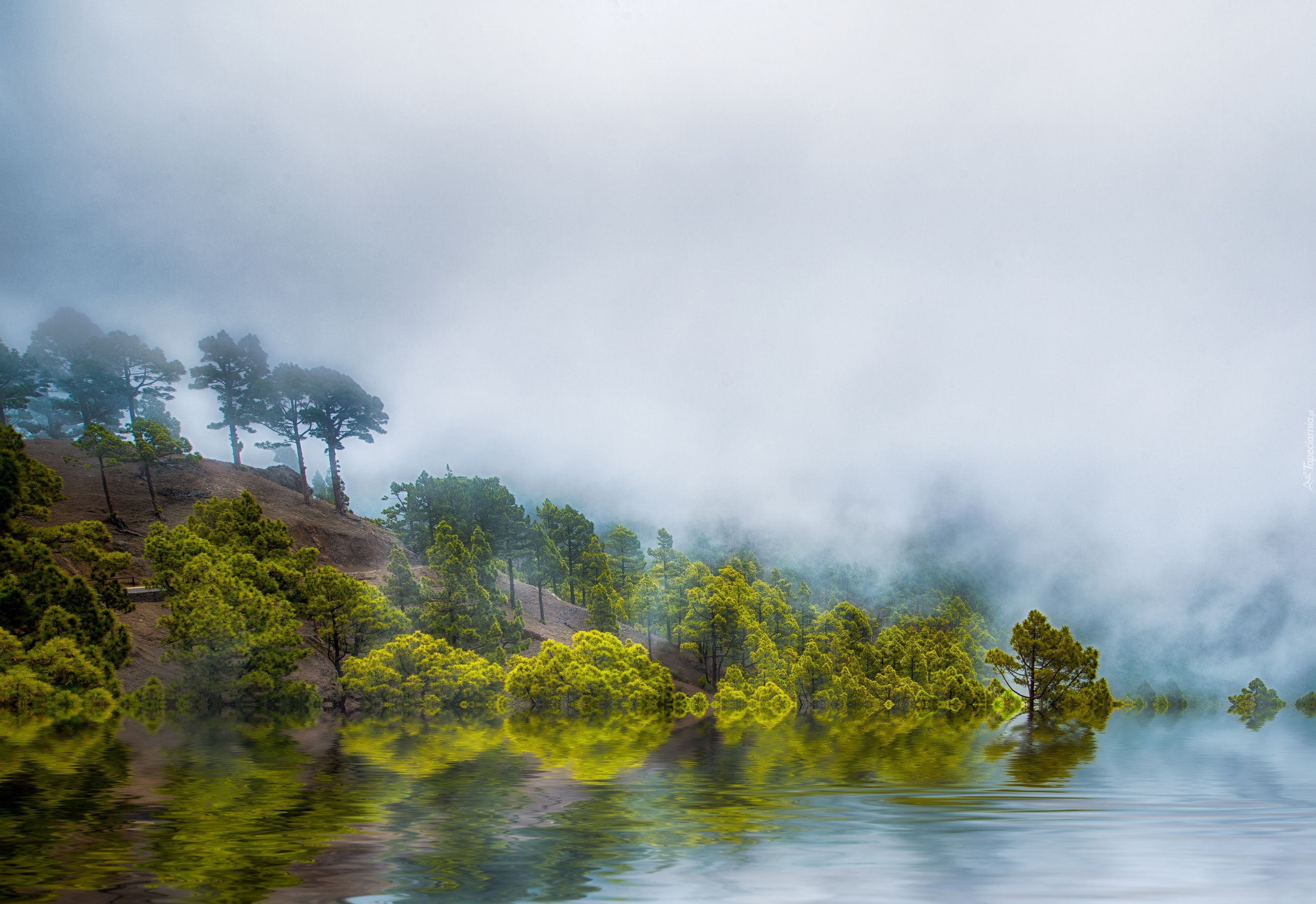 Edytor tapety: Jezioro, Drzewa, Mgła, Odbicie