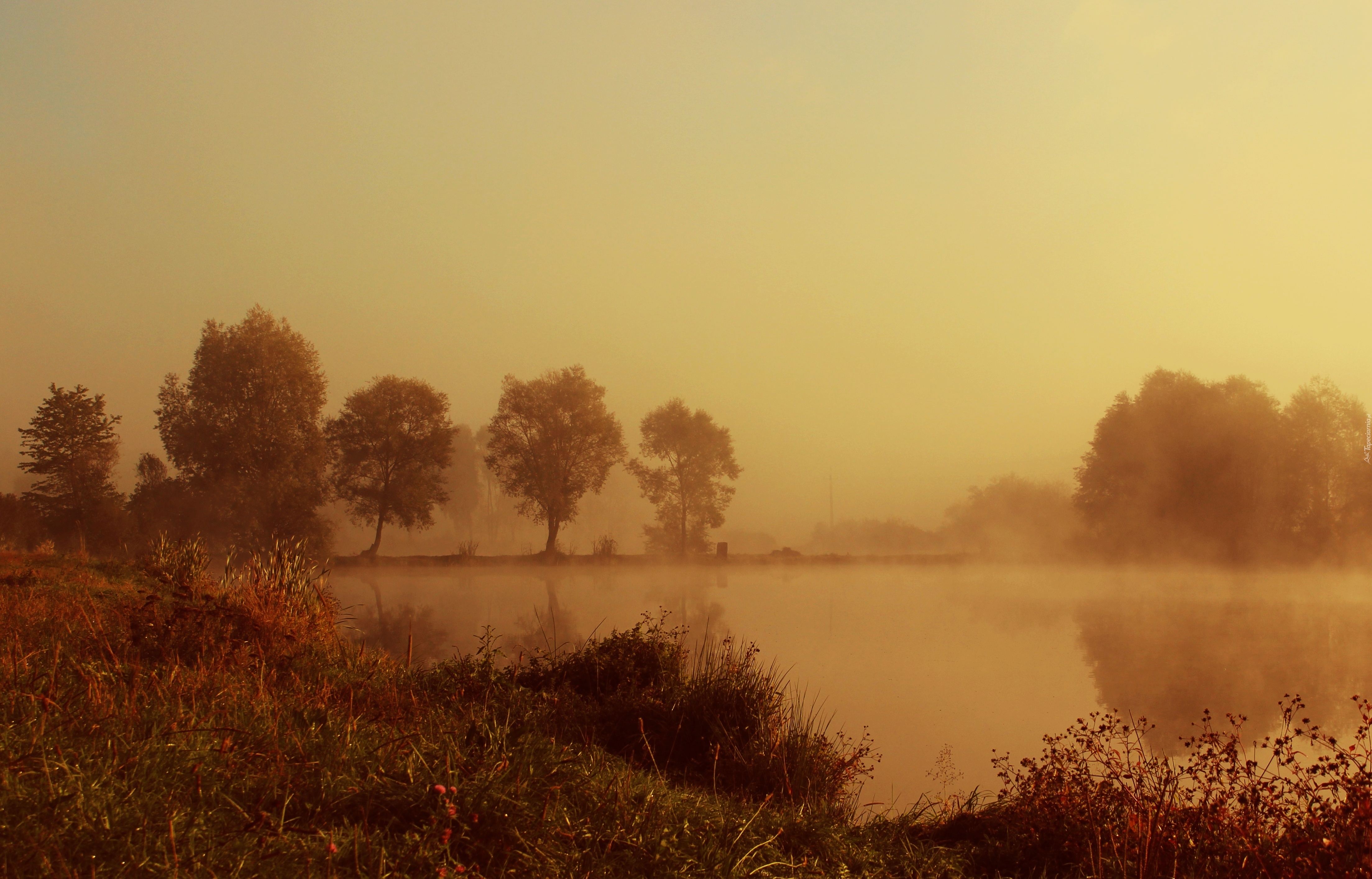 Edytor tapety: Jezioro, Świt, Mgła, Drzewa, Jesień