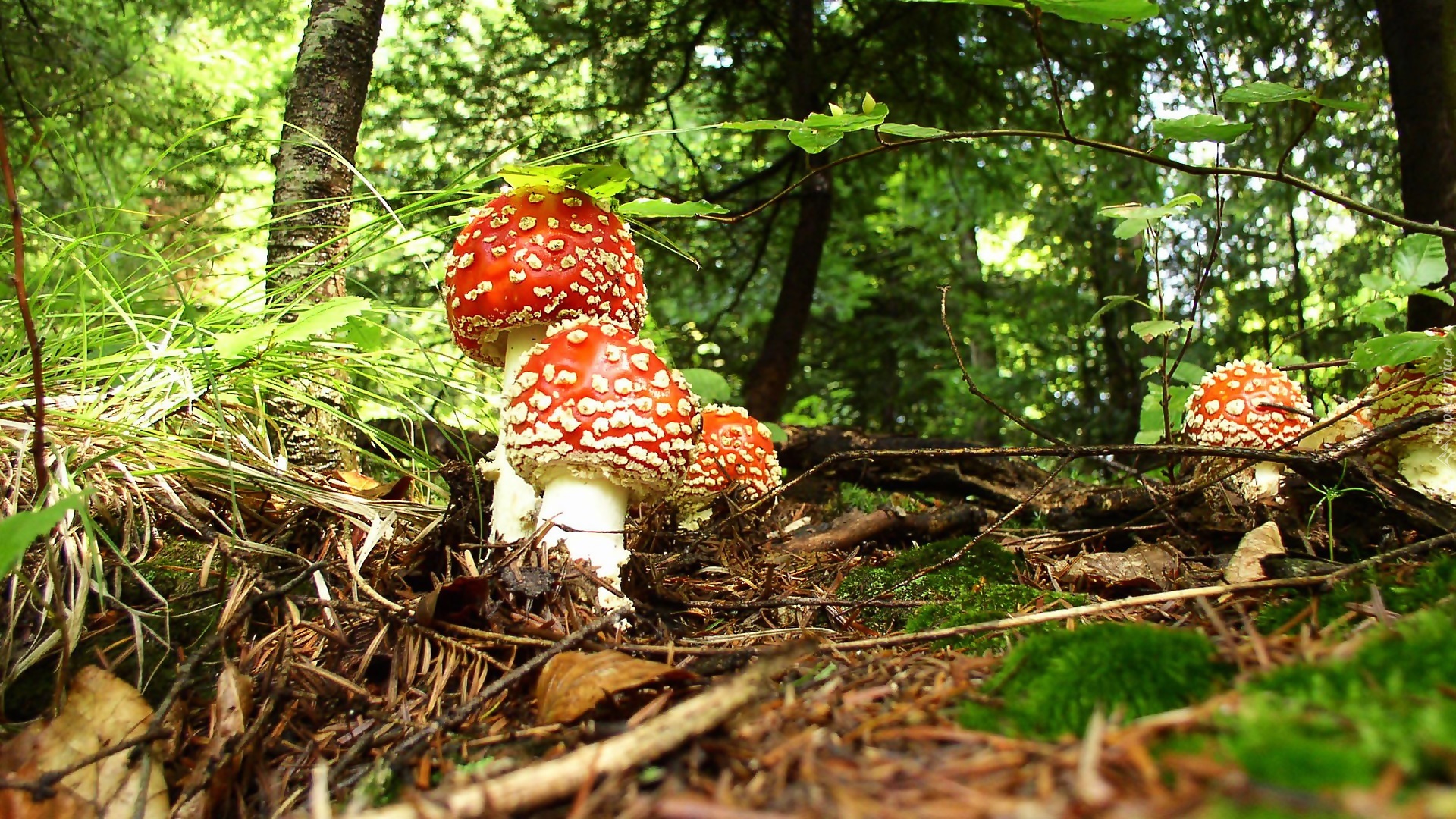 Edytor tapety: Grzyby, Muchomory, Trawa, Rośliny