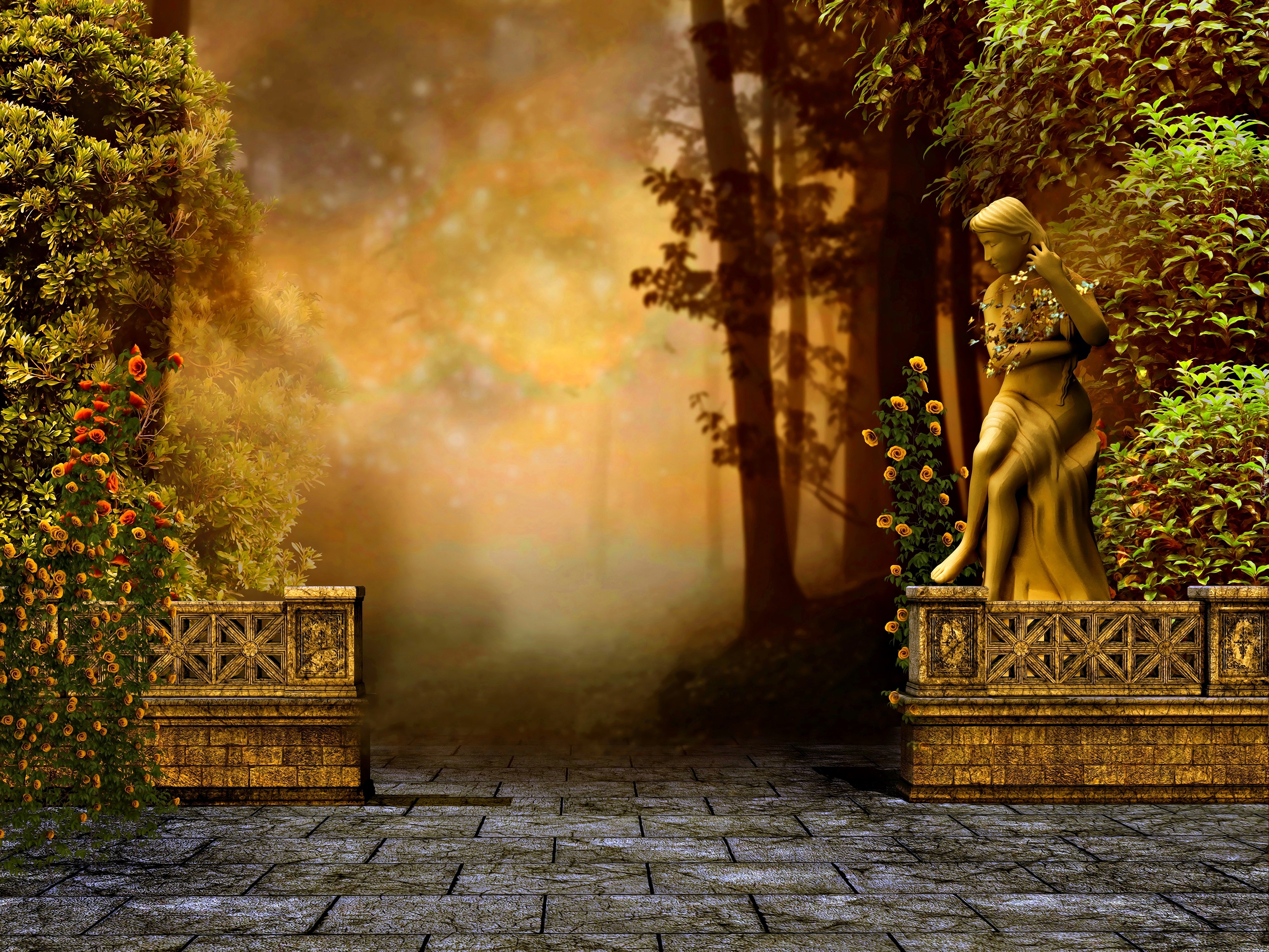 Edytor tapety: Pałacowy, Ogród, Mgła, Posąg, Kobieta