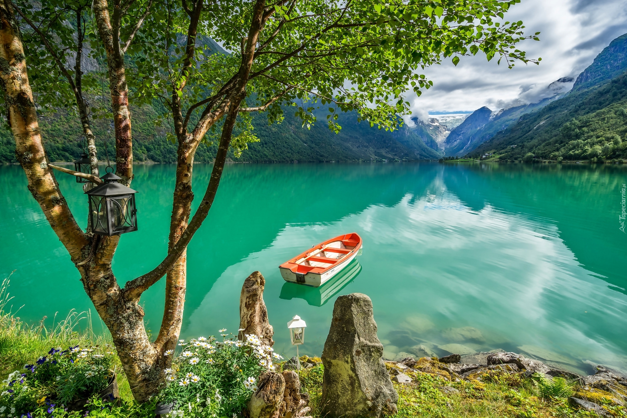 Edytor tapety: Jezioro Briksdalsbrevatnet, Łódka, Góry, Lasy, Drzewo, Lampiony, Kamienie, Okręg Vestland, Norwegia
