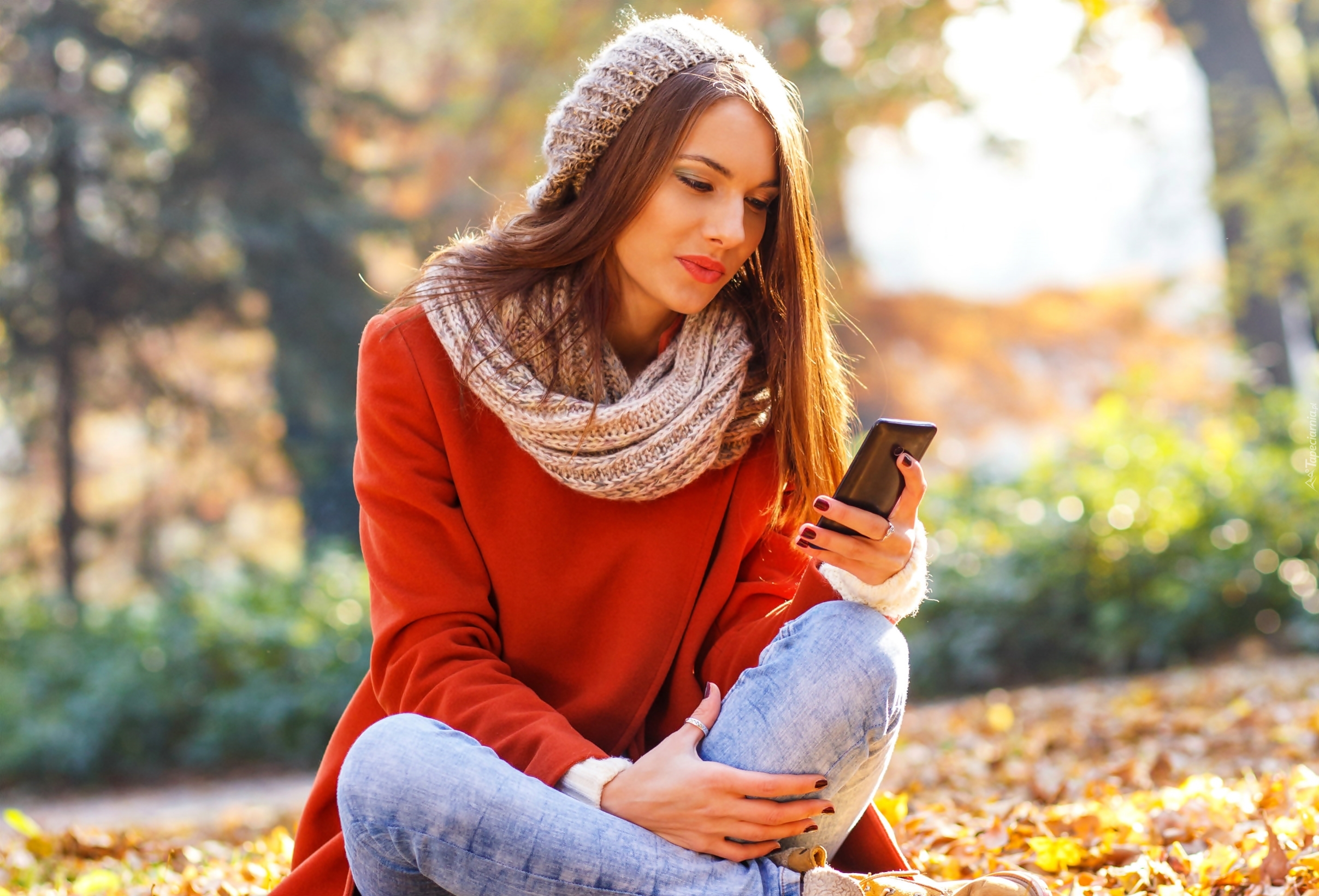 Edytor tapety: Kobieta, Telefon, Liście, Drzewa, Park, Jesień