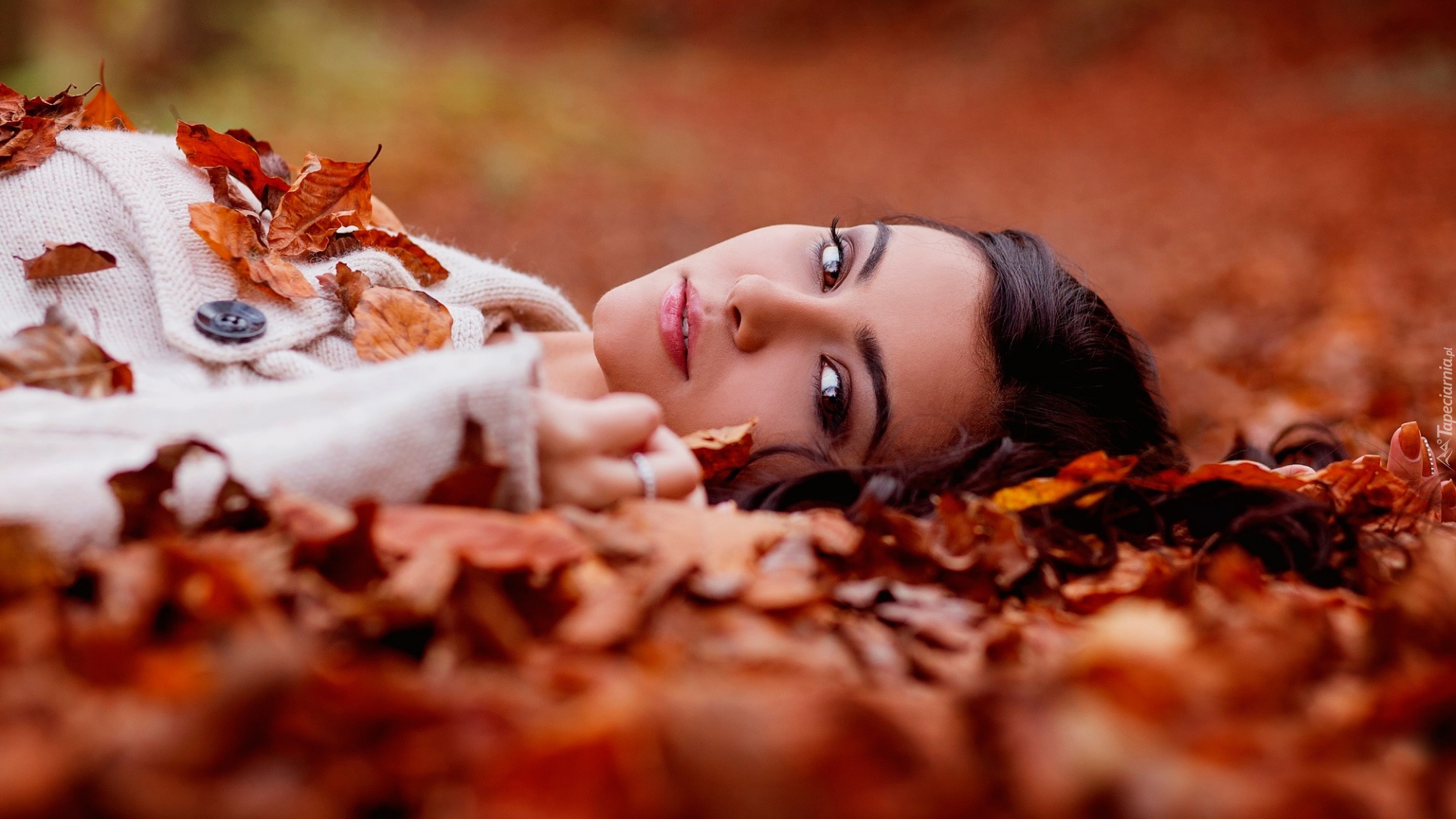 Edytor tapety: Jesień, Kobieta, Brunetka, Leży, Wśród, Liści