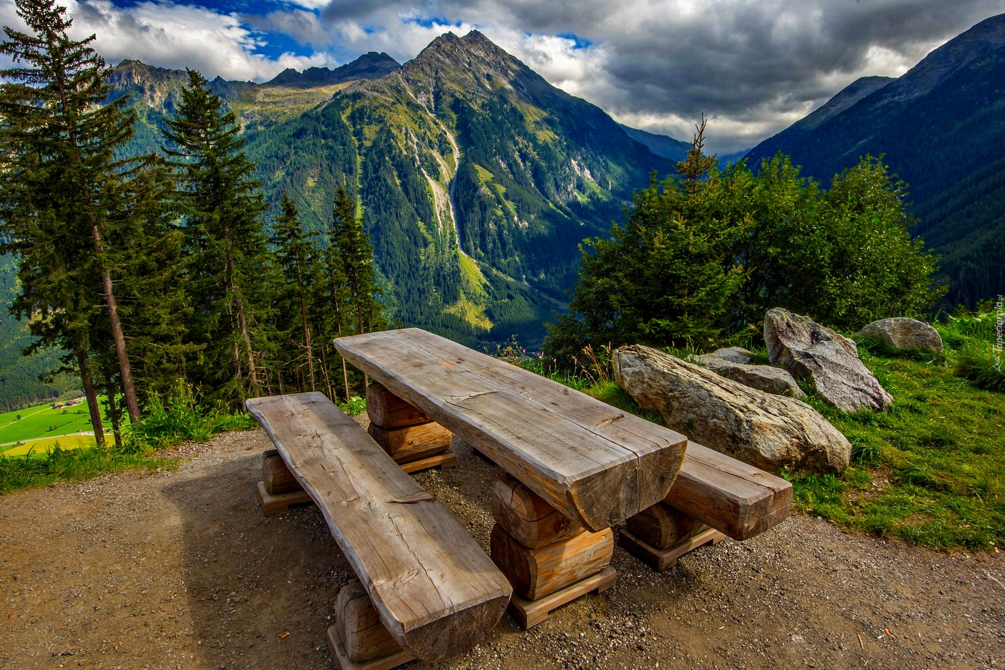 Edytor tapety: Ławka, Góry, Dolina, Krajobraz