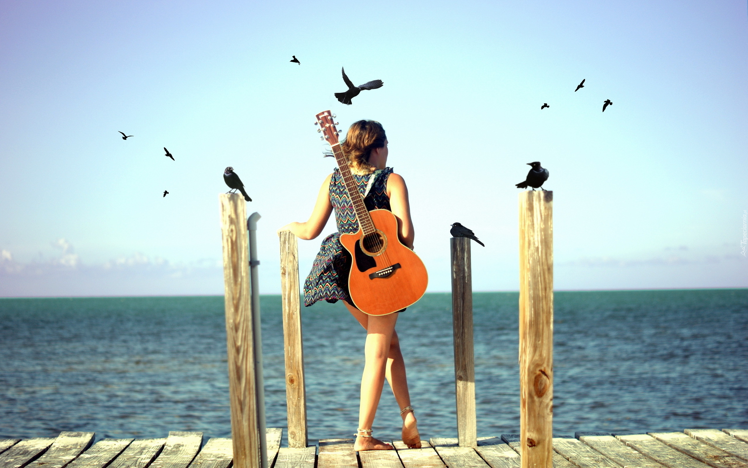 Edytor tapety: Dziewczyna, Gitara, Morze, Pomost