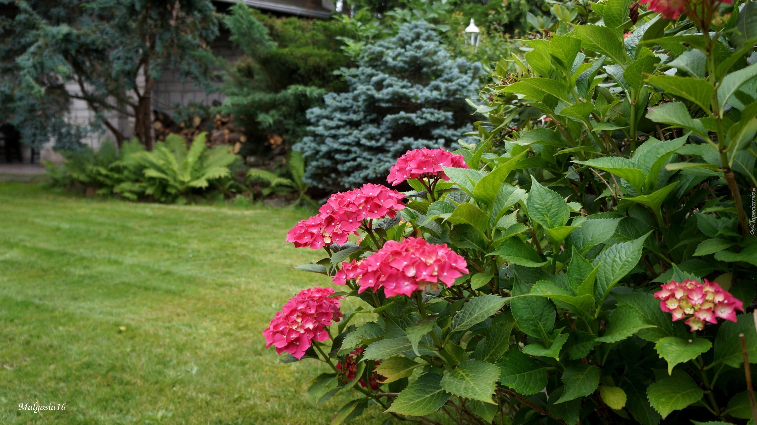 Edytor tapety: Kwitnąca, Różowa, Hortensja, Trawnik
