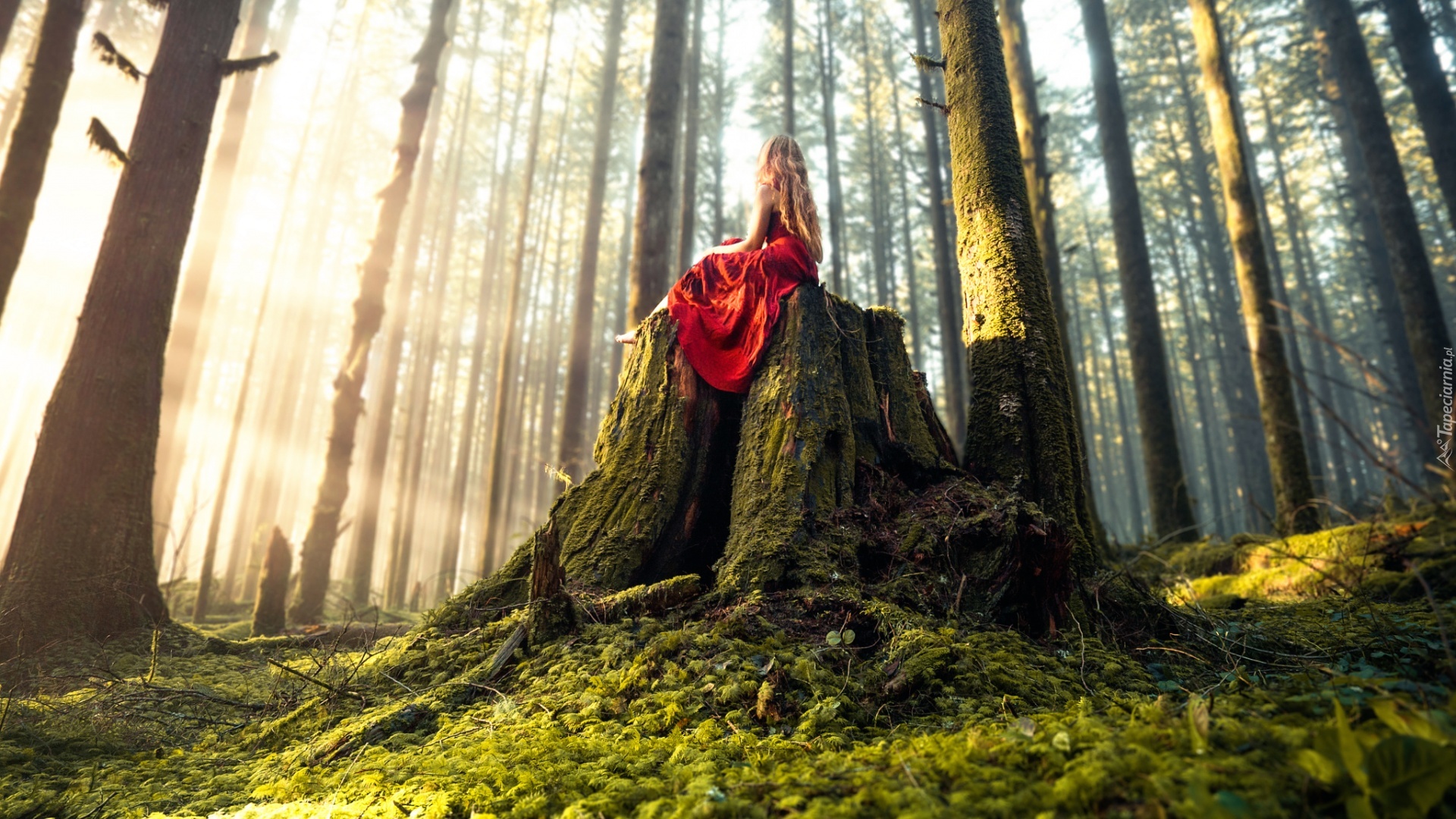 Edytor tapety: Las, Drzewa, Promienie, Słońca, Kobieta, Siedząca, Na, Pniu