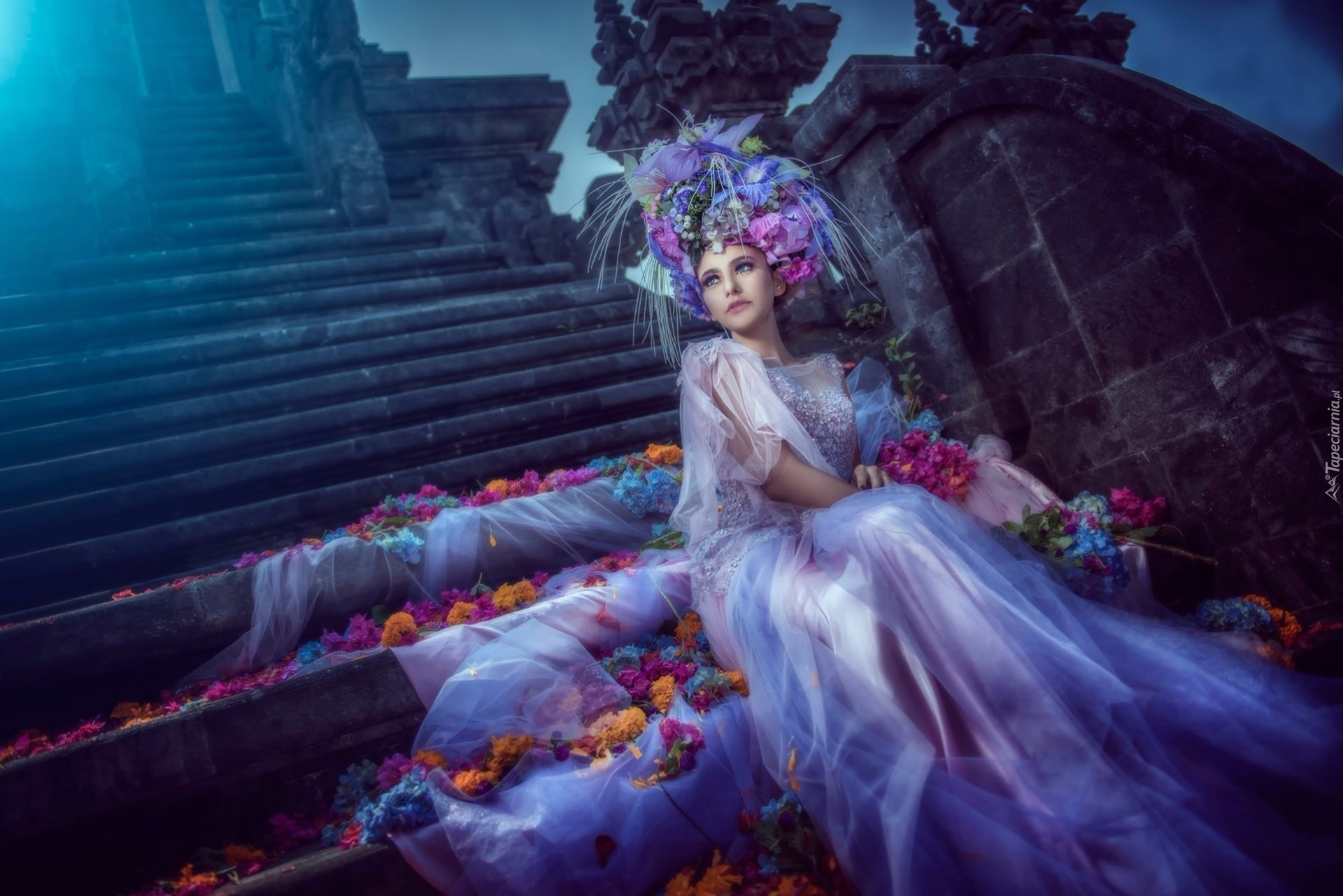 Edytor tapety: Sukienka, Kwiaty, Kobieta, Schody