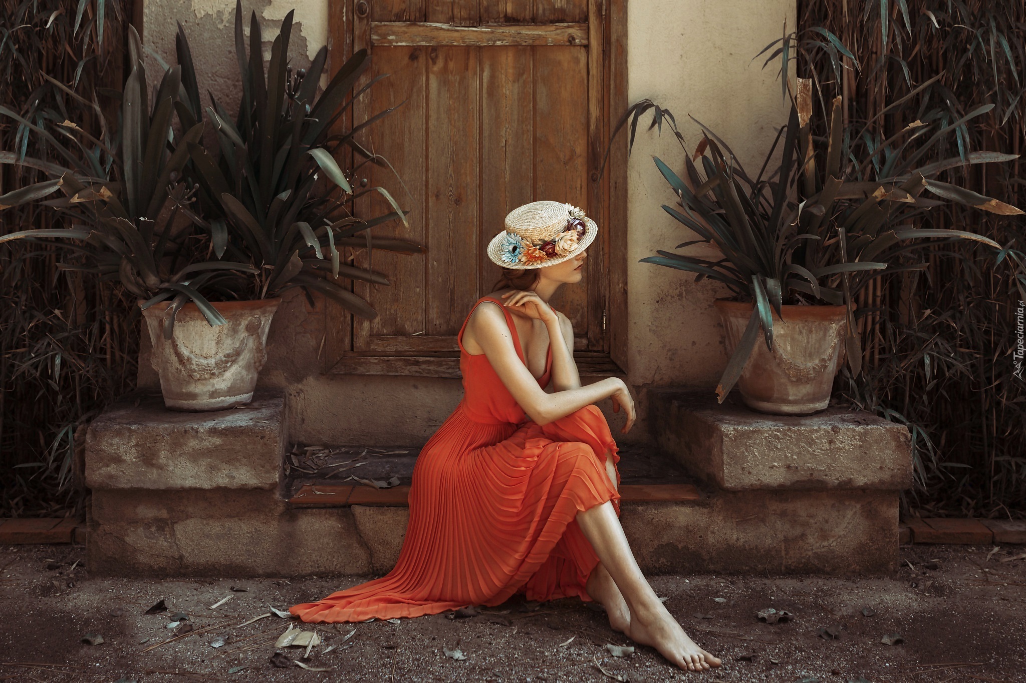 Edytor tapety: Kobieta, Czerwona, Sukienka, Kapelusz, Schody, Dom