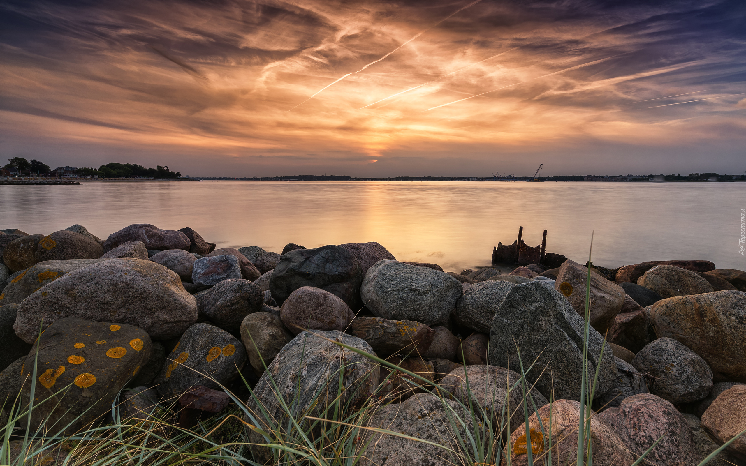 Edytor tapety: Jezioro, Zachód słońca, Kamienie, Niebo