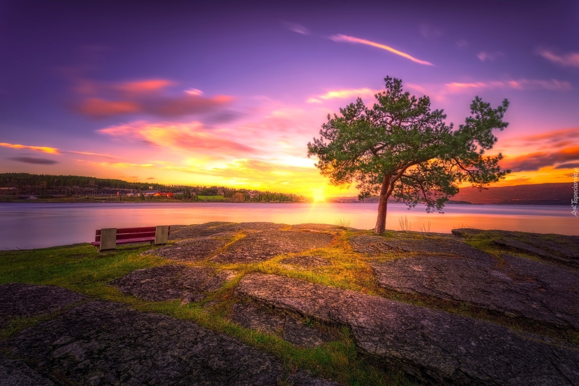 Edytor tapety: Wschód słońca, Rzeka, Drzewo, Ławka