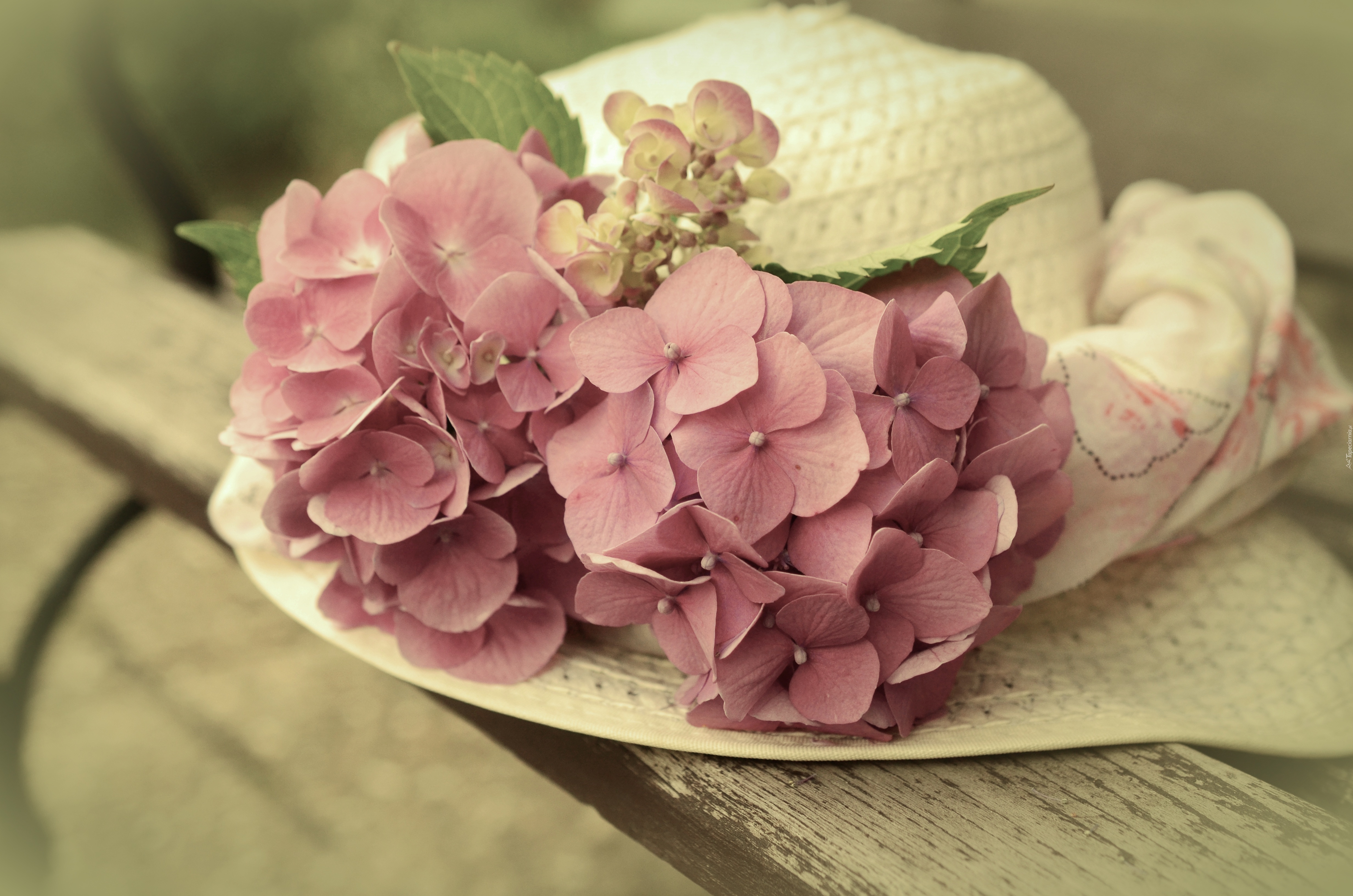 Edytor tapety: Biały, Kapelusz, Kwiat, Hortensji, Ławka