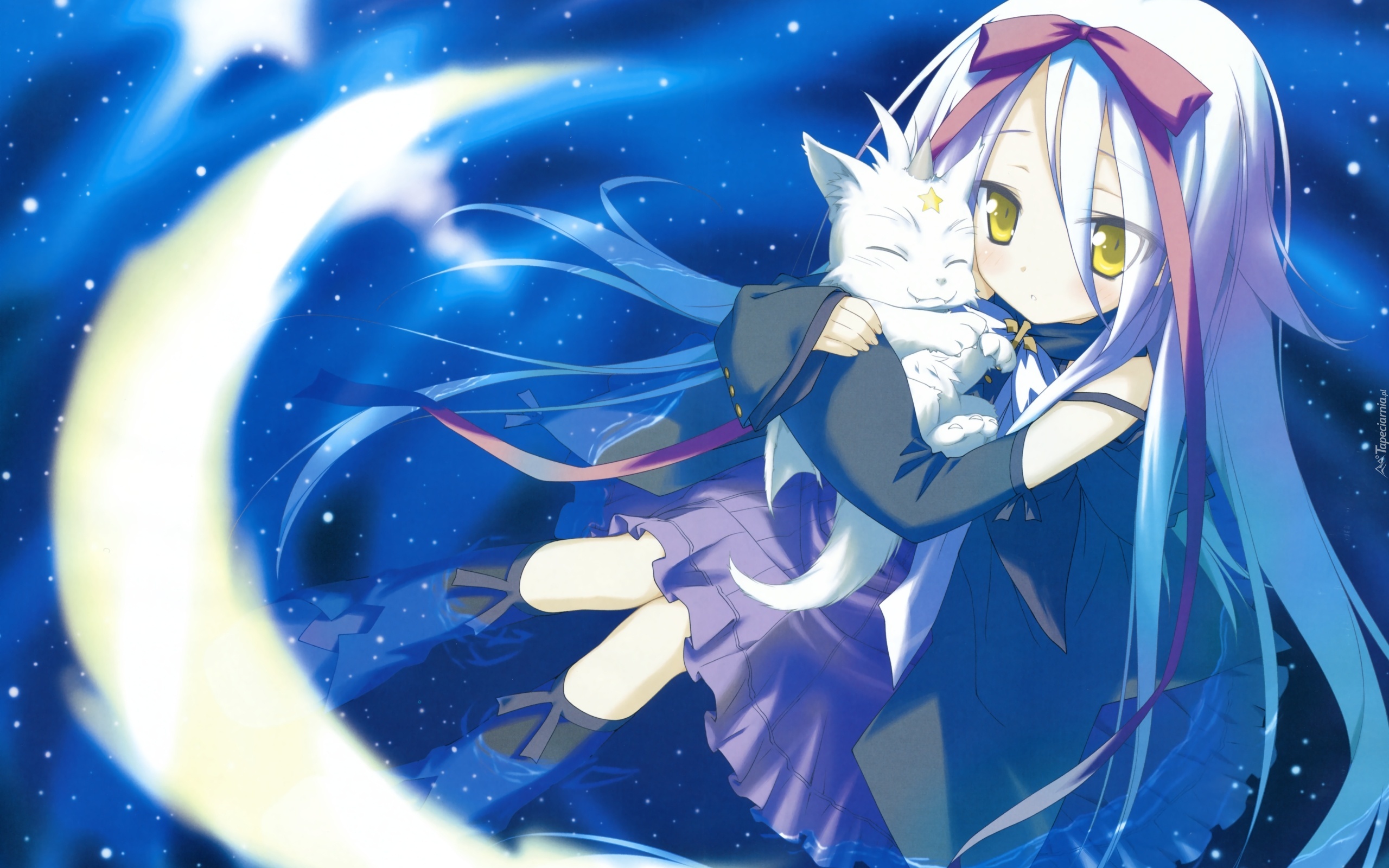 Edytor tapety: Dziewczyna, Kot, Woda, Księżyc, Gwiazdy, Manga, Anime