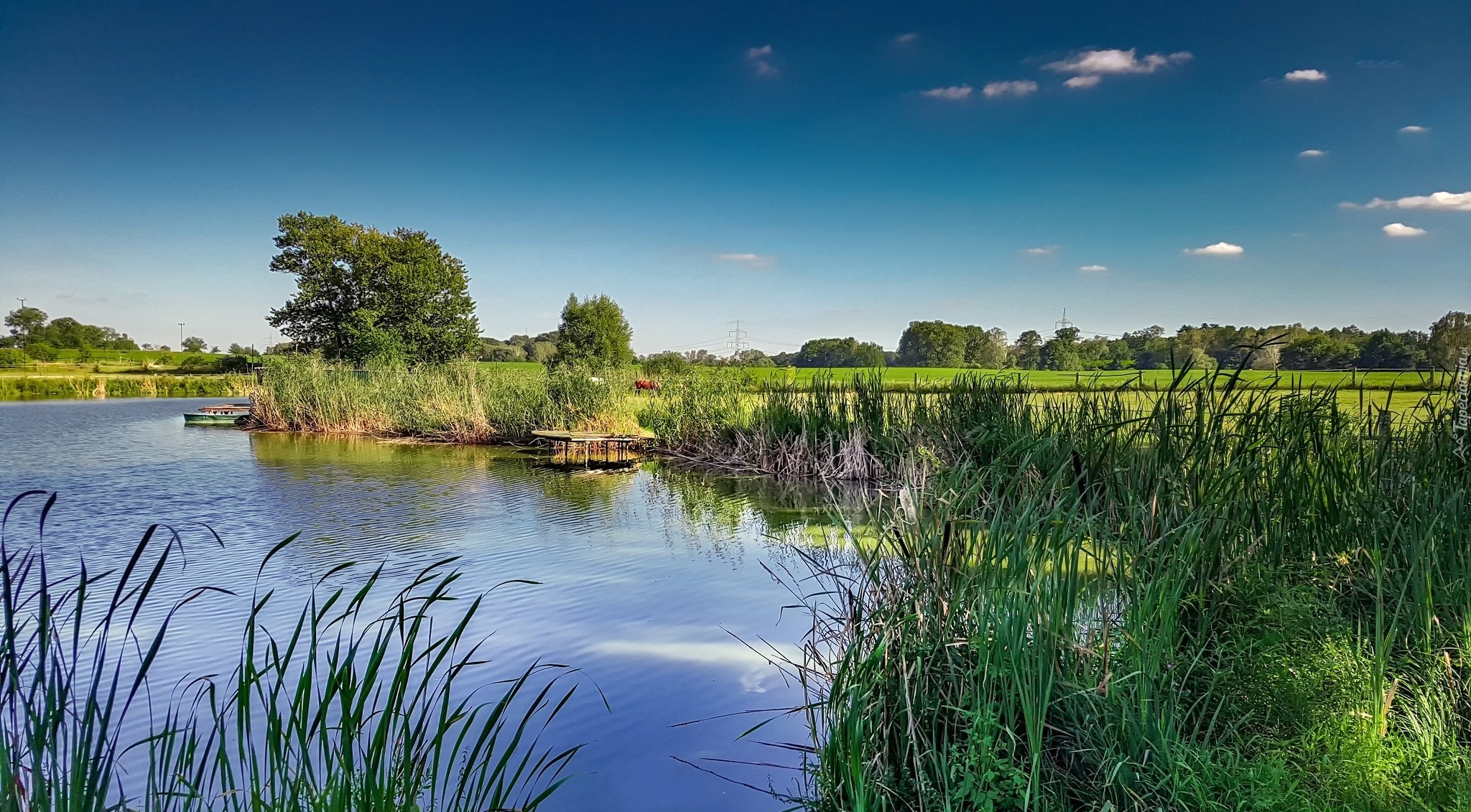 Edytor tapety: Jezioro, Łąka, Konie, Pomost, Łódka