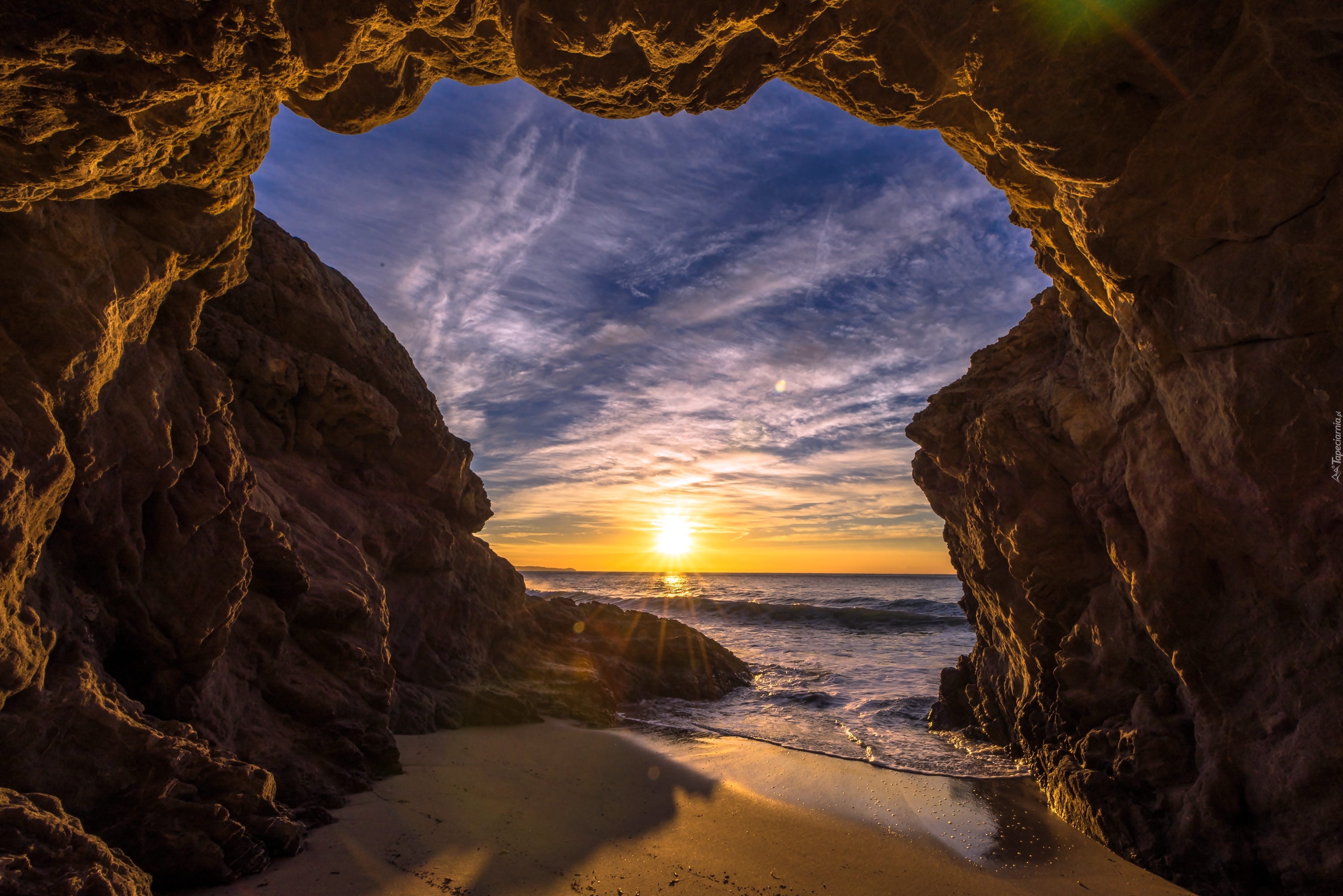 Edytor tapety: Morze, Jaskinia, Skały, Zachód Słońca