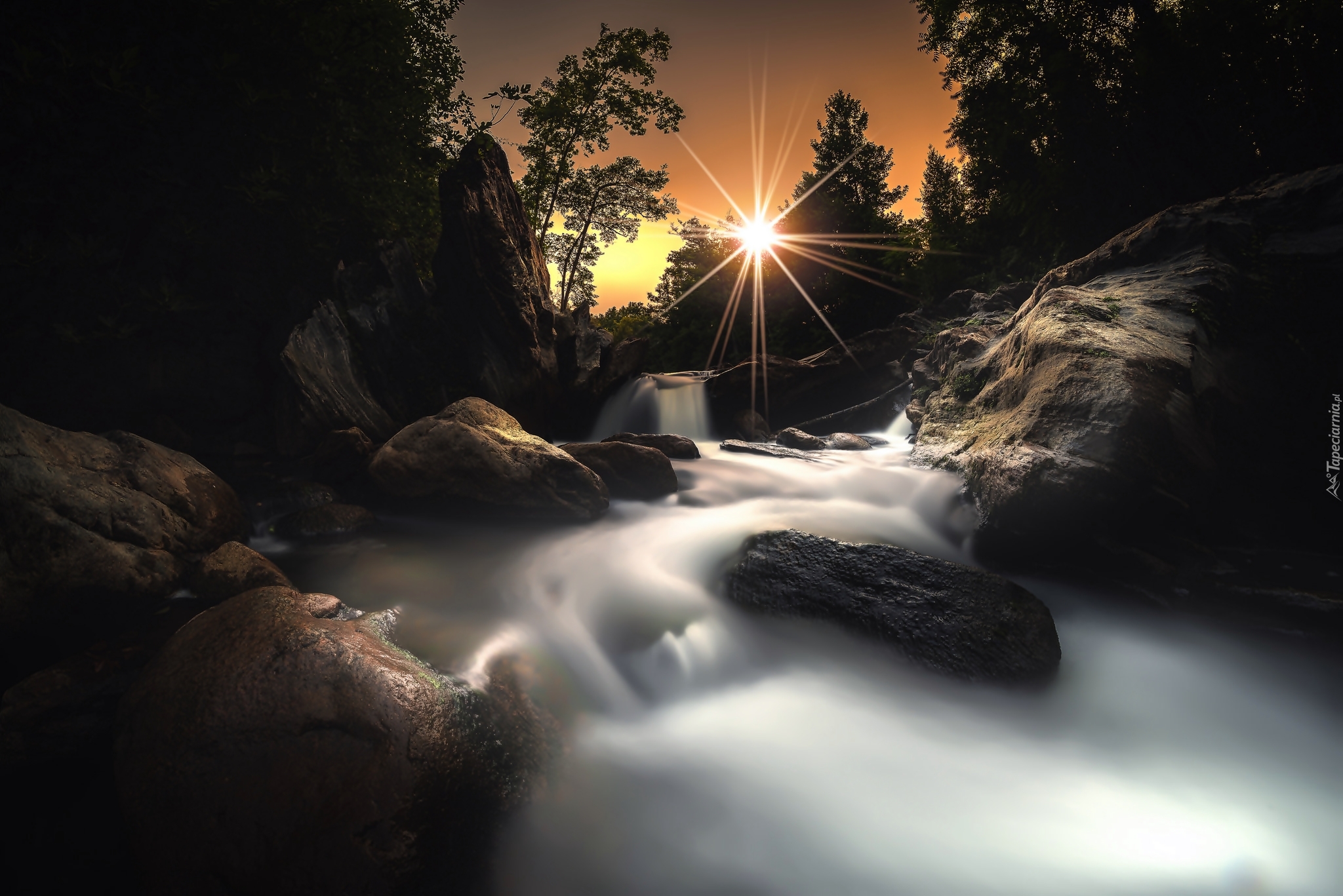 Edytor tapety: Rzeka, Skały, Promienie Słońca