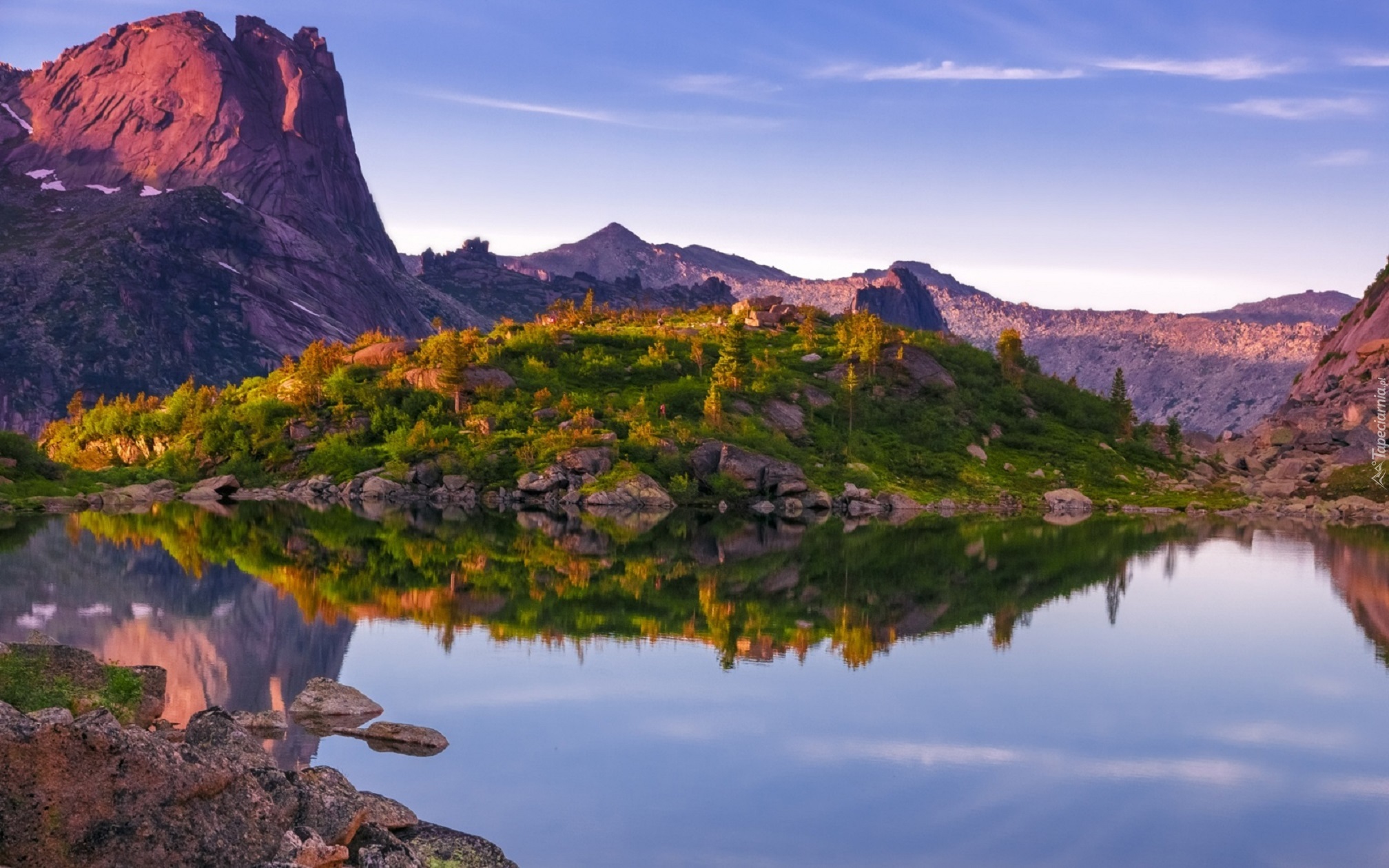 Edytor tapety: Jezioro, Skały, Kamienie, Roślinność, Odbicie