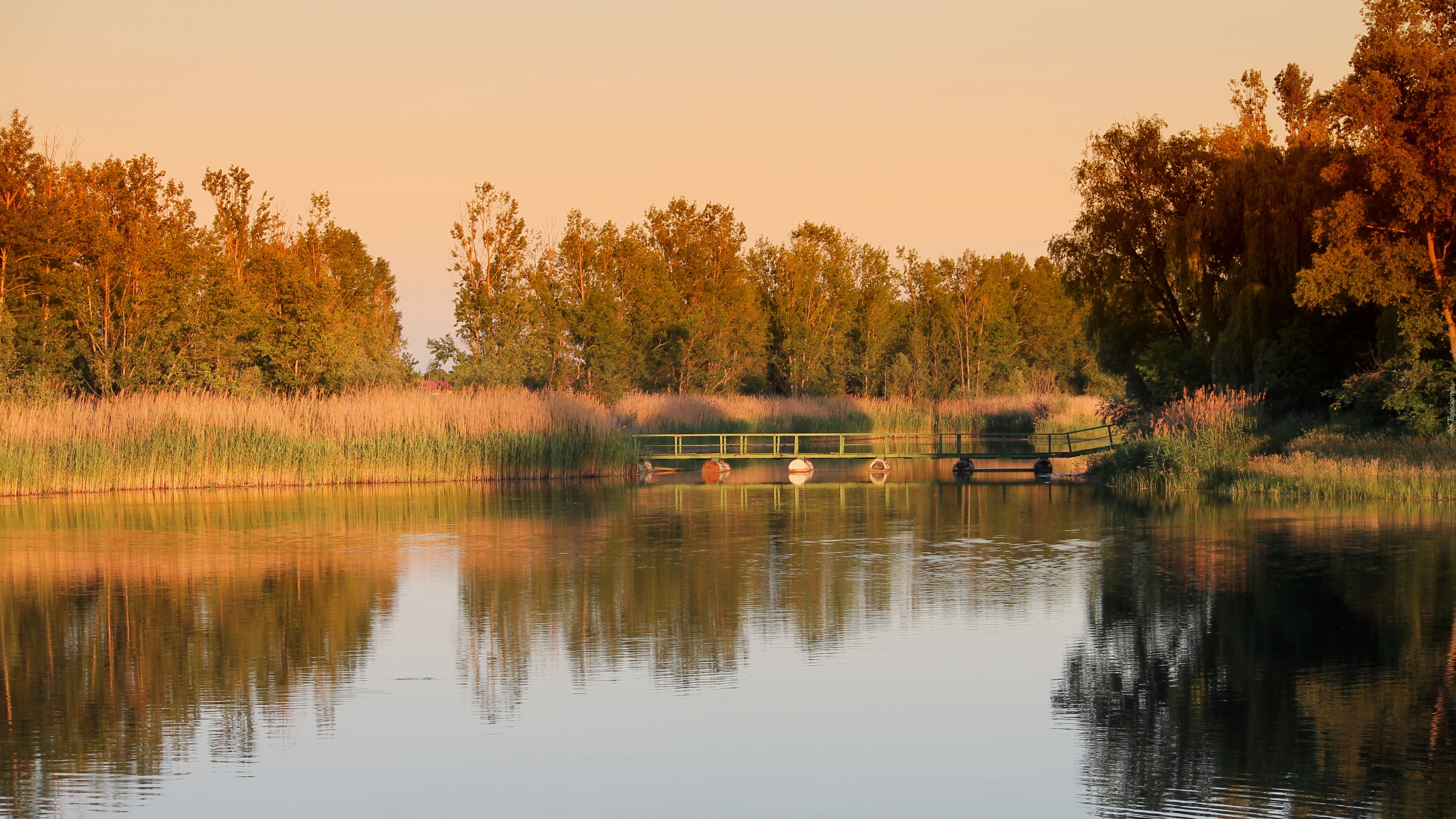 Edytor tapety: Jezioro, Odbicie, Trzciny, Drzewa, Zachód, Słońca, Jesień