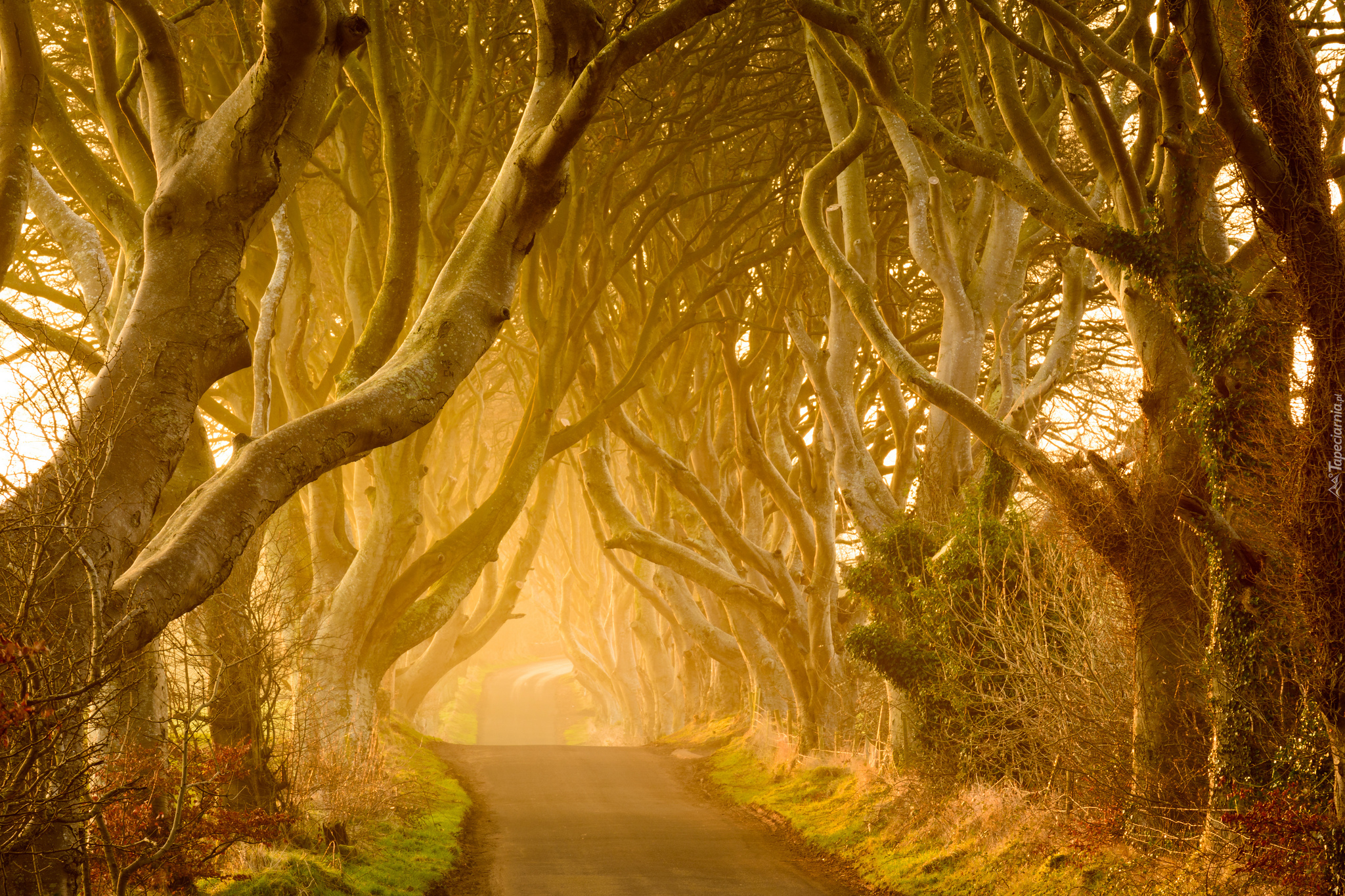 Edytor tapety: Bezlistne, Drzewa, Droga, Mgła