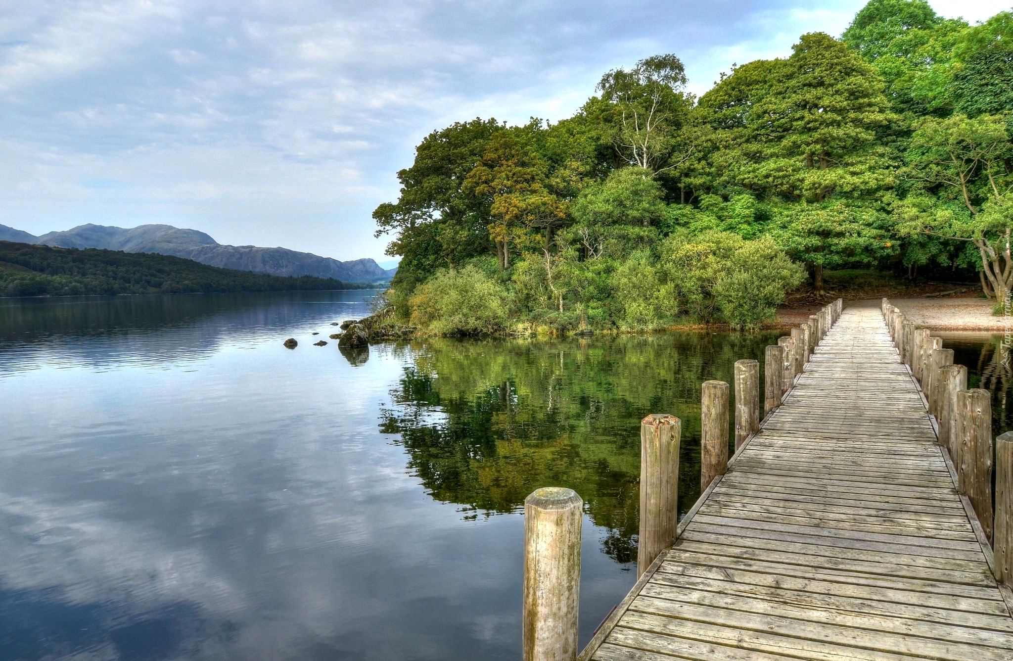 Edytor tapety: Rzeka, Drzewa, Góry, Pomost