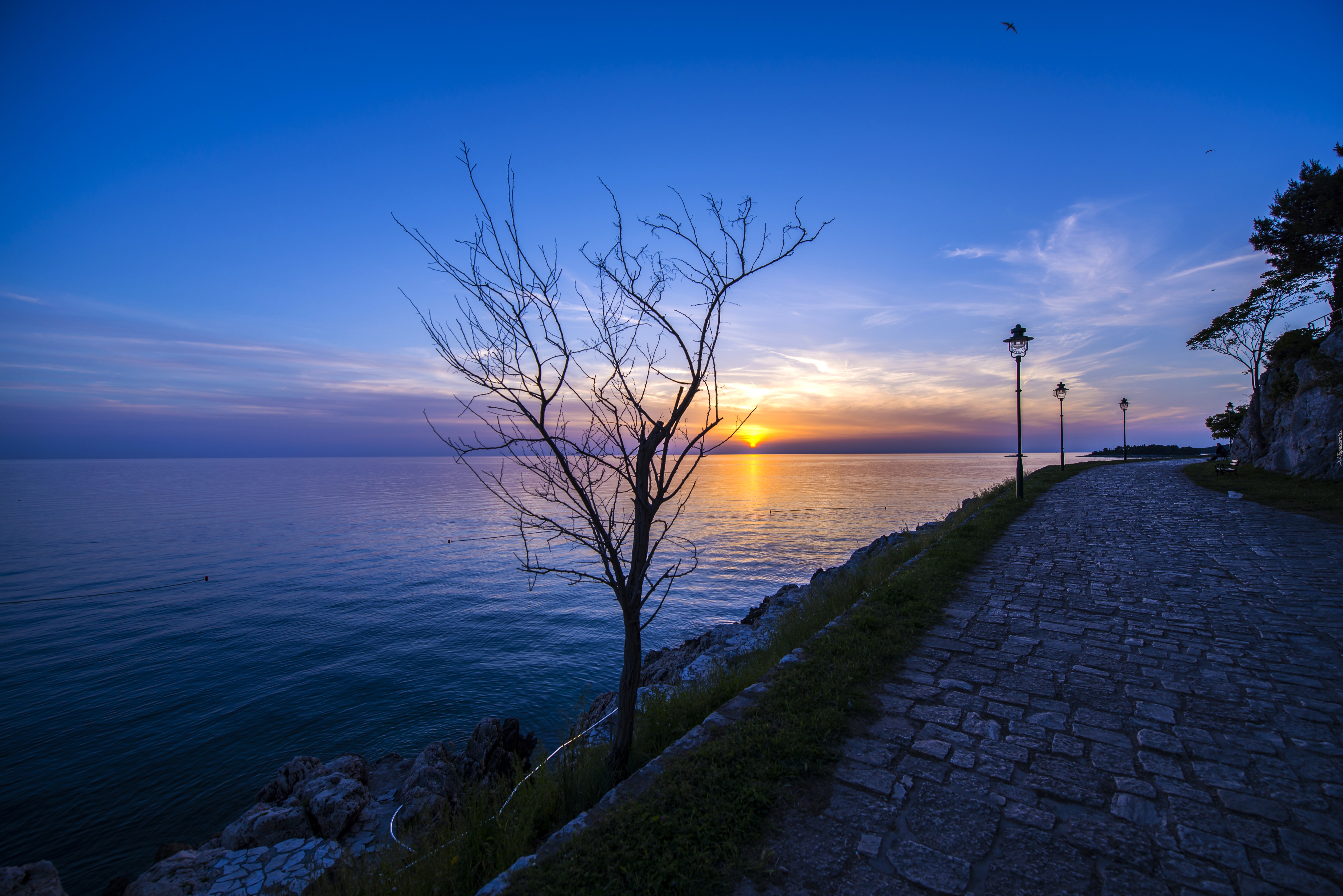 Edytor tapety: Jezioro, Wysepka, Aleja, Drzewa, Ławki, Latarnie, Zachód, Słońca