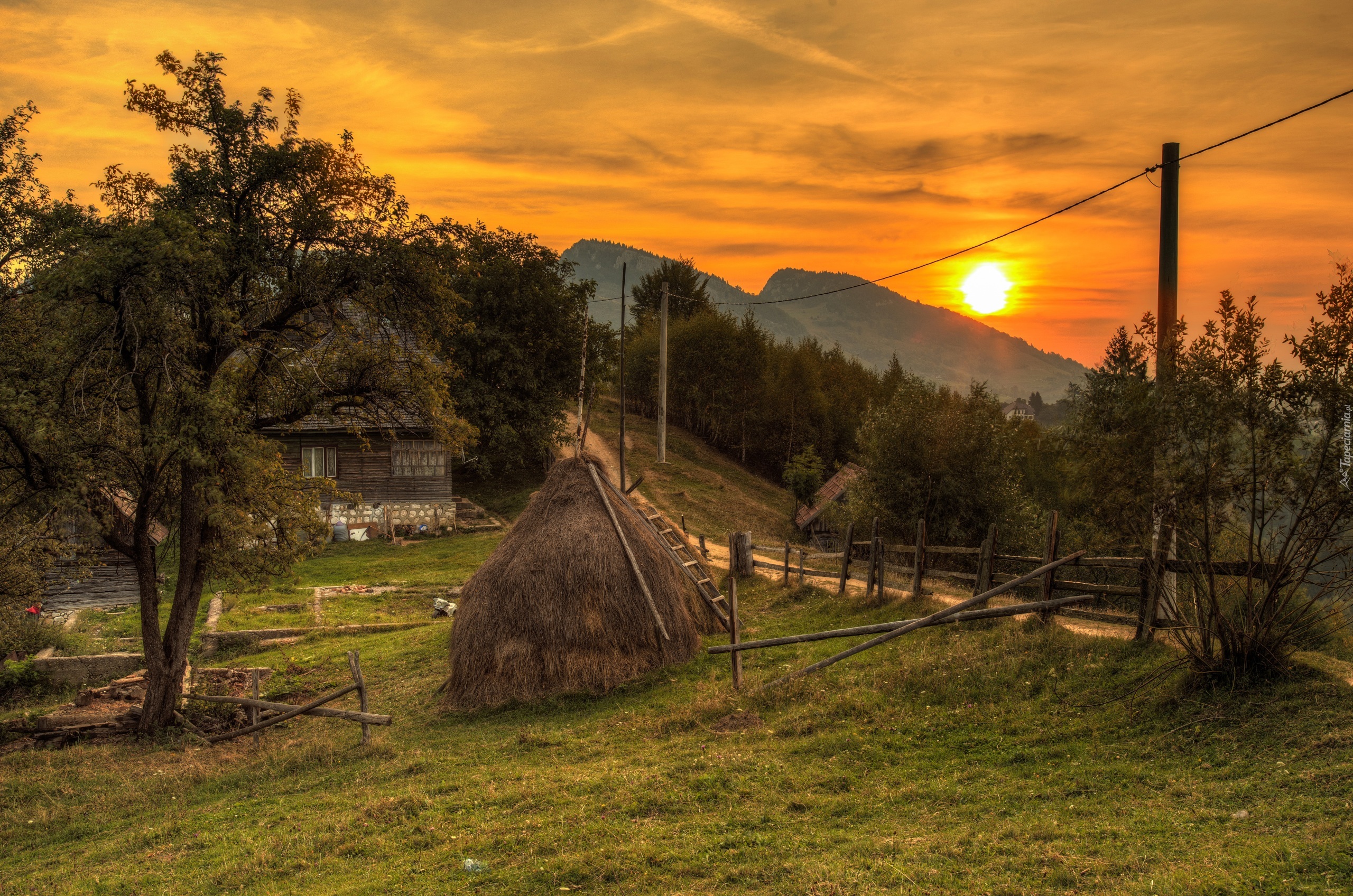 Edytor tapety: Góry, Zachód słońca, Droga, Drzewa