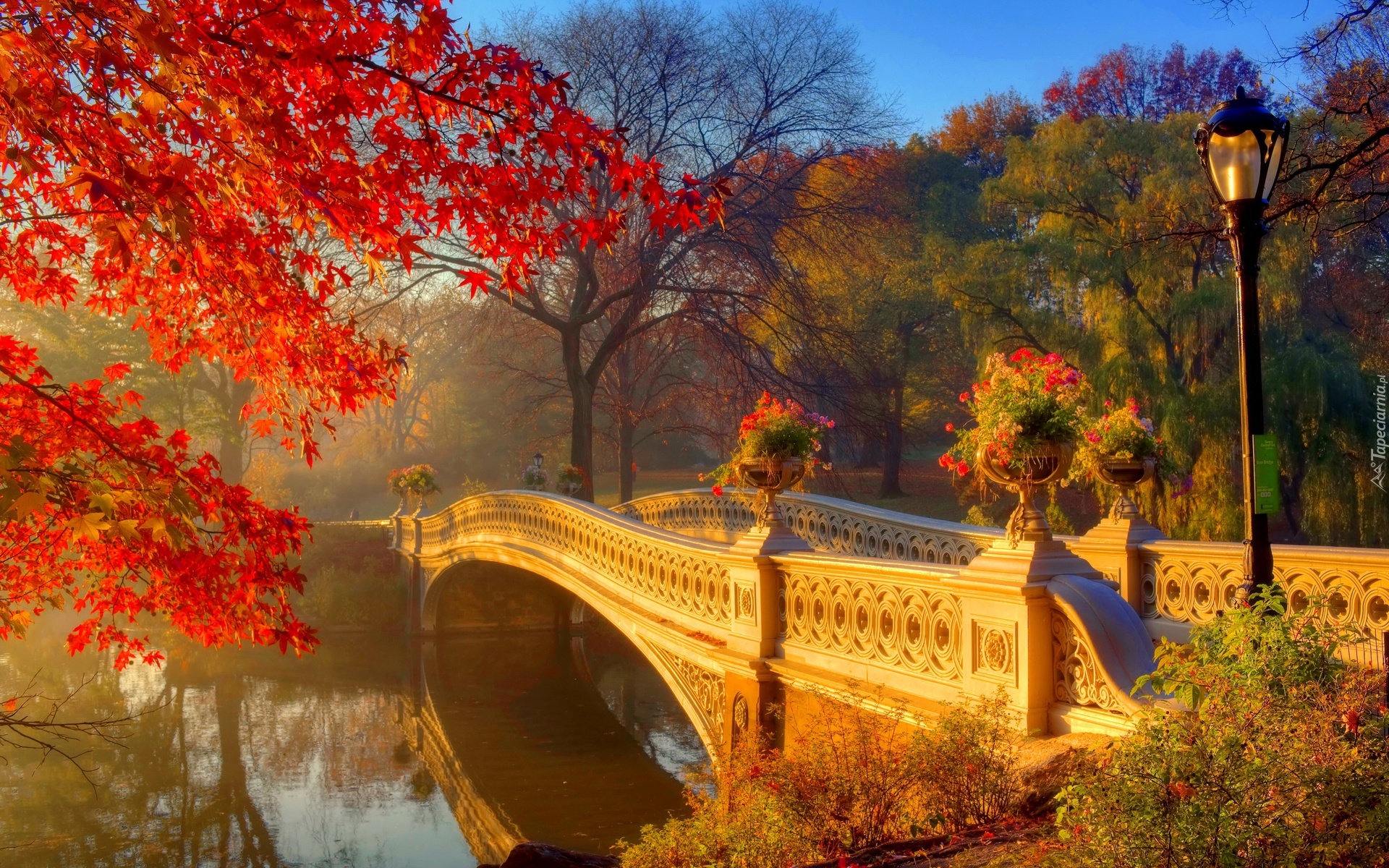 Edytor tapety: Jesień, Most, Rzeka, Drzewa, Latarnia